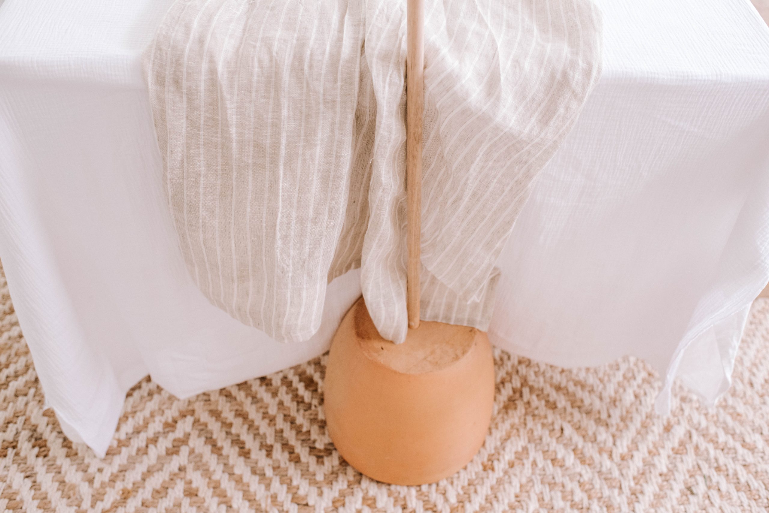 - Grab your fabric, and set it up over the top, making sure to bring it down the sides so it covers the pots and dowel.