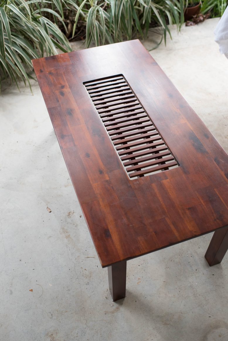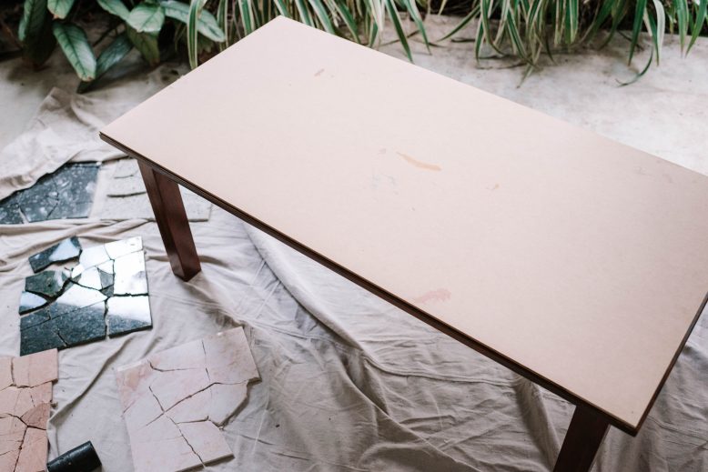 Because my table had slits in it, I added a piece of plywood on top. This created a nice flat surface for your tiles to stick to. If your table is already flat you wont need to do this.