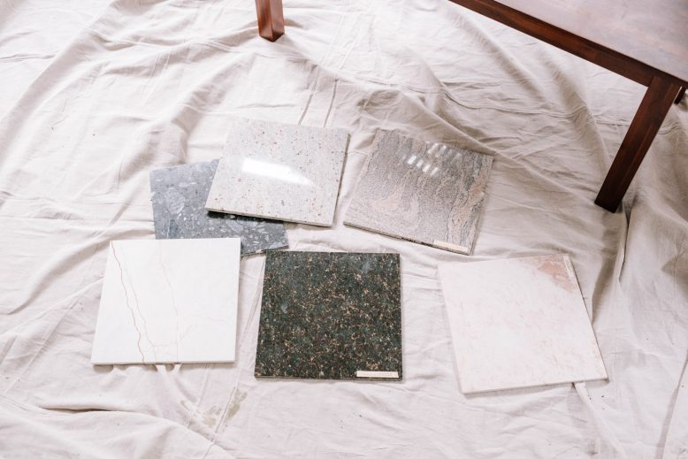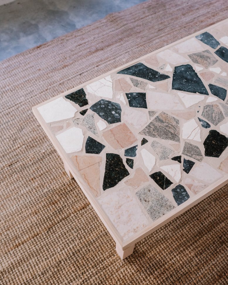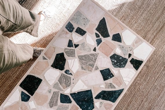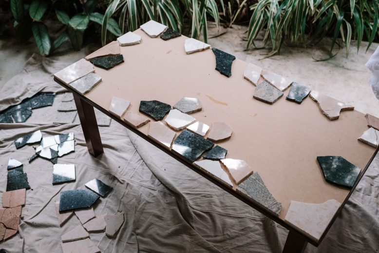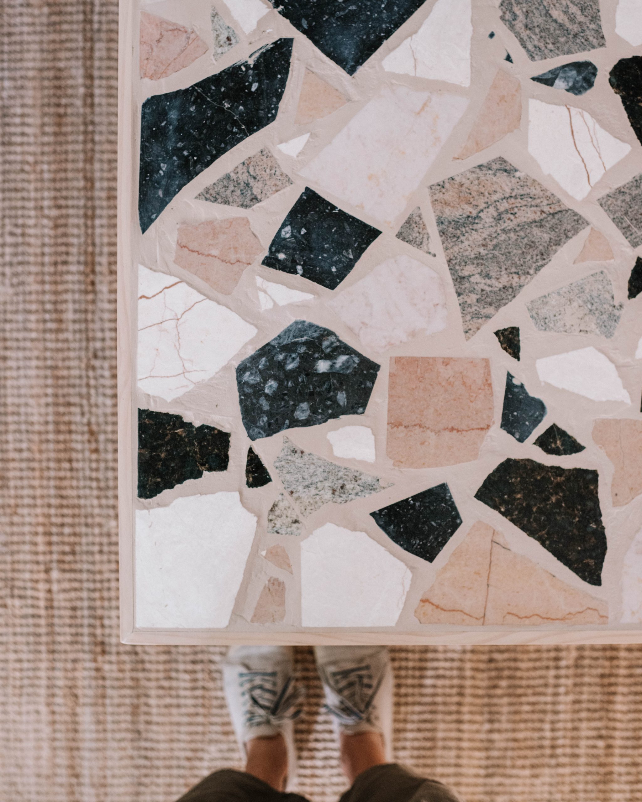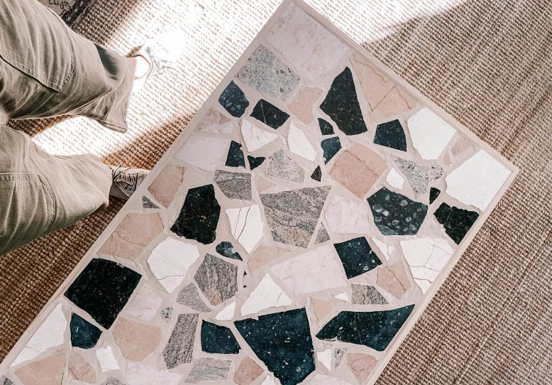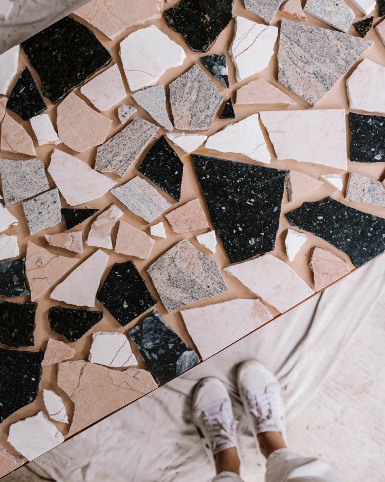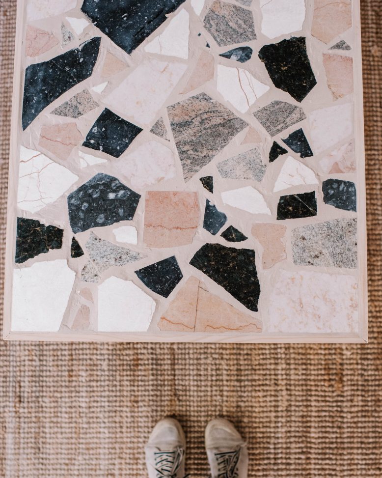 For this project, I was really lucky to be able to find some sample stone tiles that a marble shop was throwing away. So take a look in secondhand stores, recycle shops or even ask interior designers you know as they always have samples they don’t use. For me, using stone has a nice effect because the breaks are less sharp than using ceramic tiles, but ceramic tiles still looks nice too and are easier to come by.