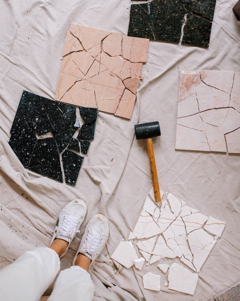 Using a rubber headed hammer, smash your tiles into smaller pieces. Remember to place a drop cloth over them before you start to whack to protect the tiles and yourself.