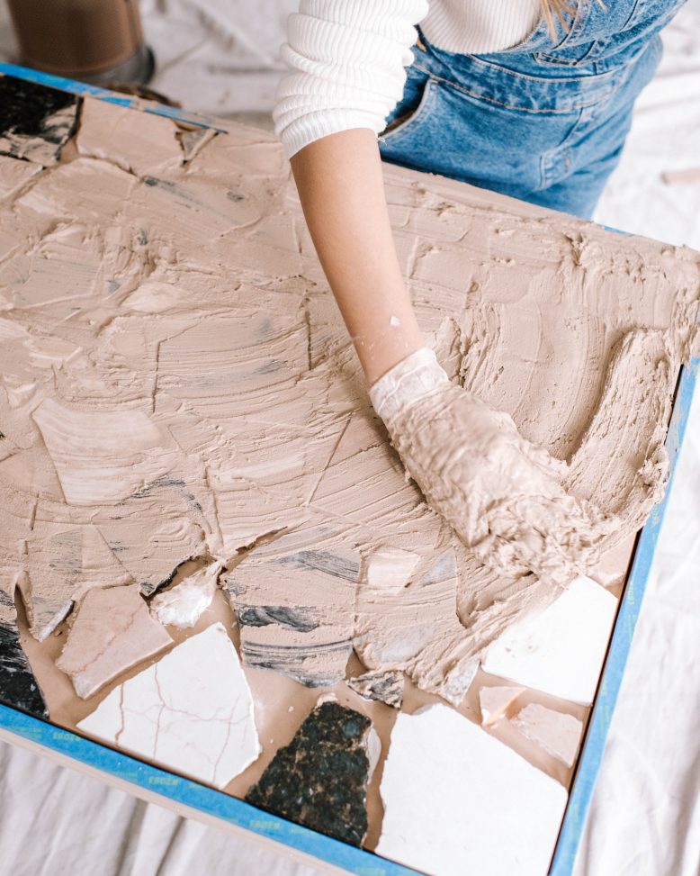 You can then start to place your tile pieces. I began by lining the outer edge to create a nice clean finish around the edges. Then I filled in the rest of the space, first with bigger pieces and then smaller ones to fill the gaps.