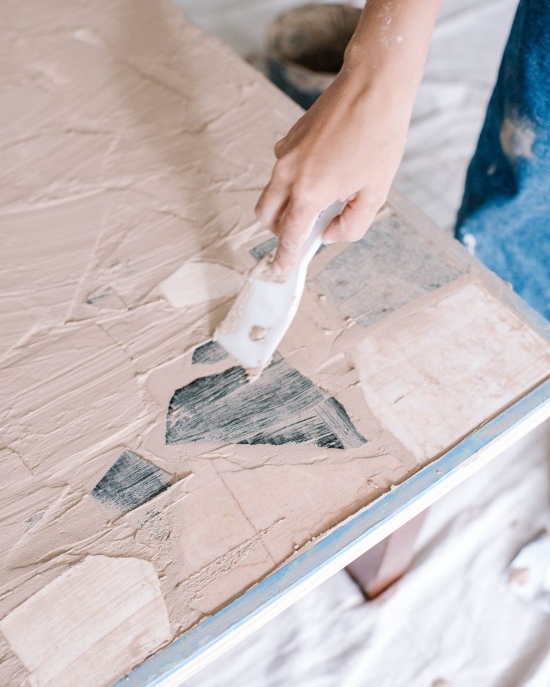 Using painters tape, tape off the wood so its protected from the grout. Mix your grout using the packet instructions. After some testing of colours I ended up using the taupe colour. Smear it all over the top ensuring all the gaps are filled and let it dry. Make sure you remove the painters tape before the grout dries so it doesn't get stuck!