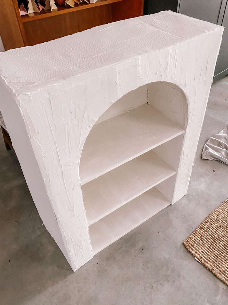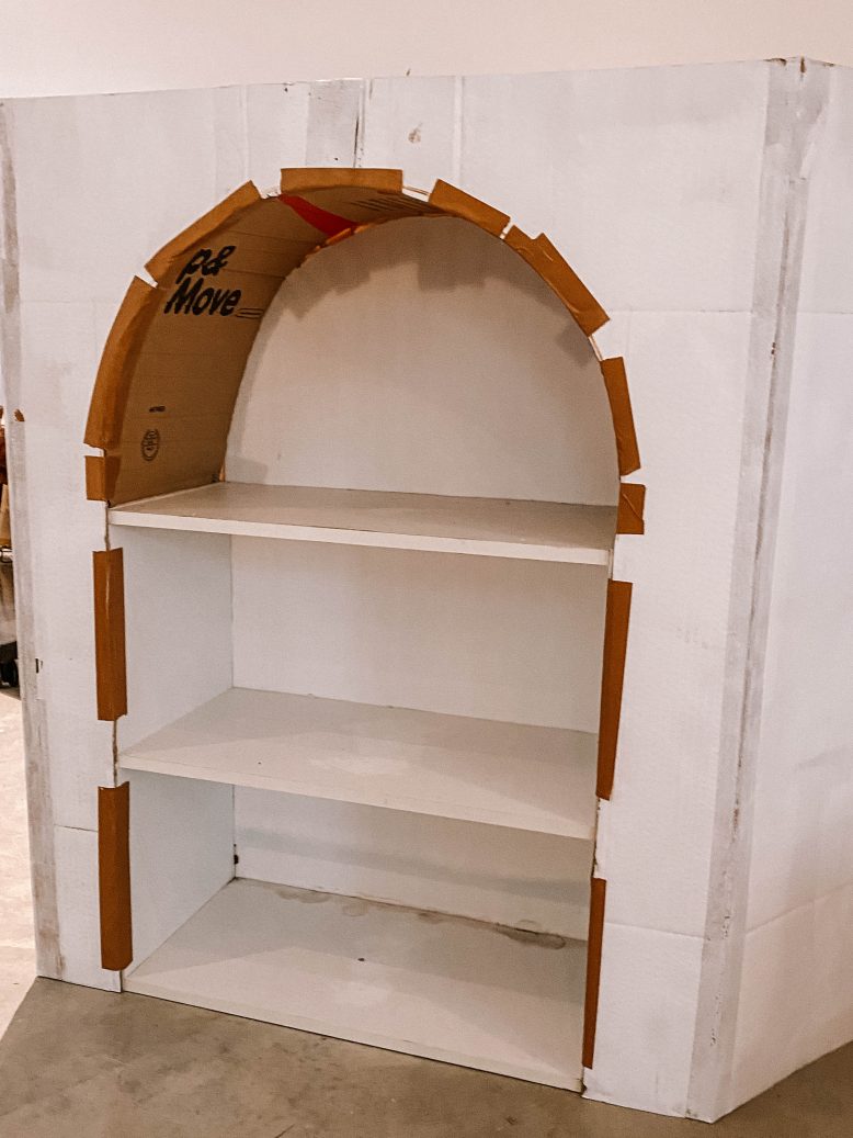 Find a large piece of cardboard to act as your front and sides. Measure the shelf and arch that you have already created so you know how big to cut your arch out. Make sure your piece of cardboard is big enough to sit over the front and also bend around to each side. You can make this as big as you want depending on how large you want your shelf to be overall. I had to tape two pieces of cardboard together to make it big enough.