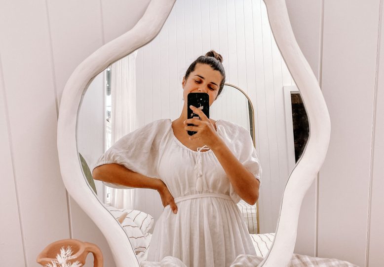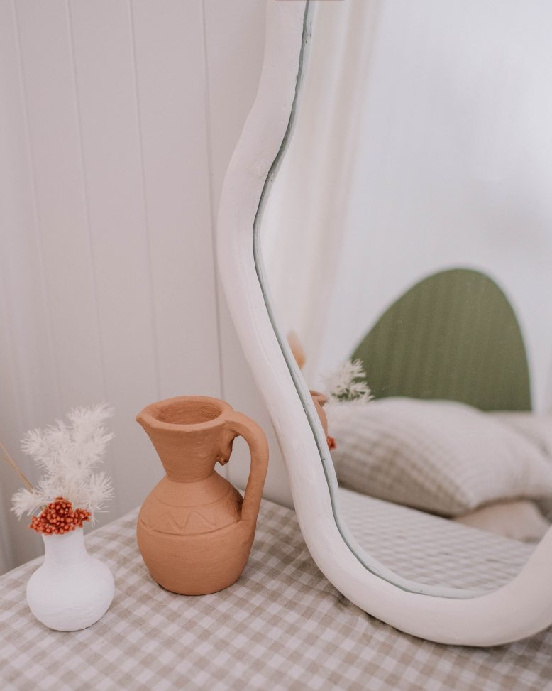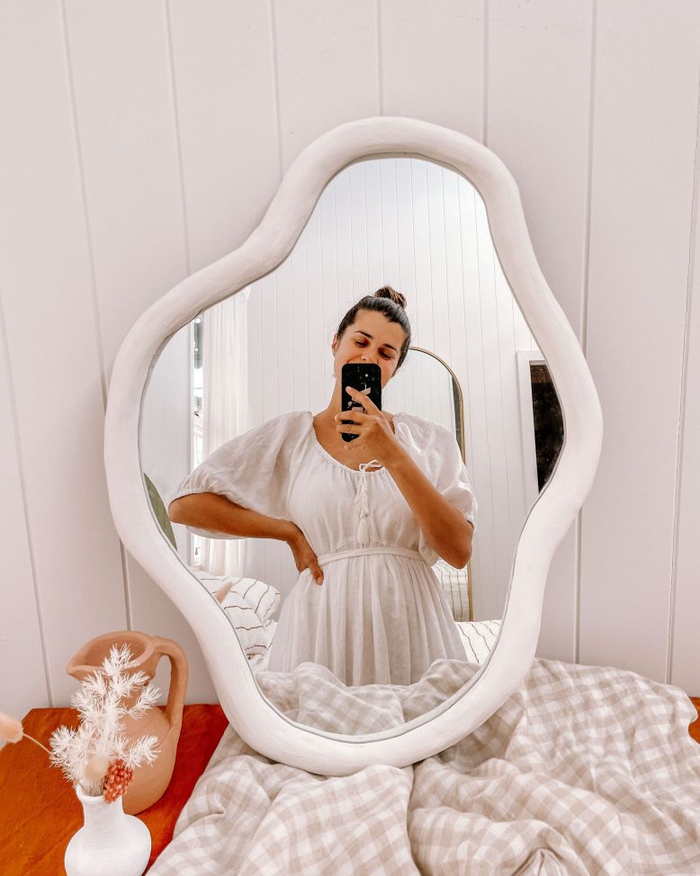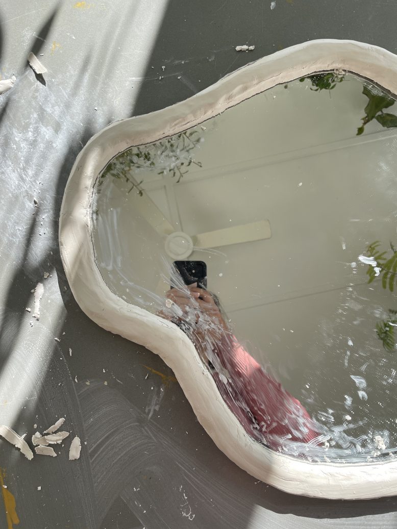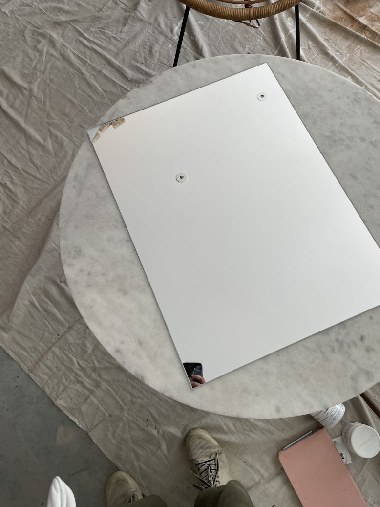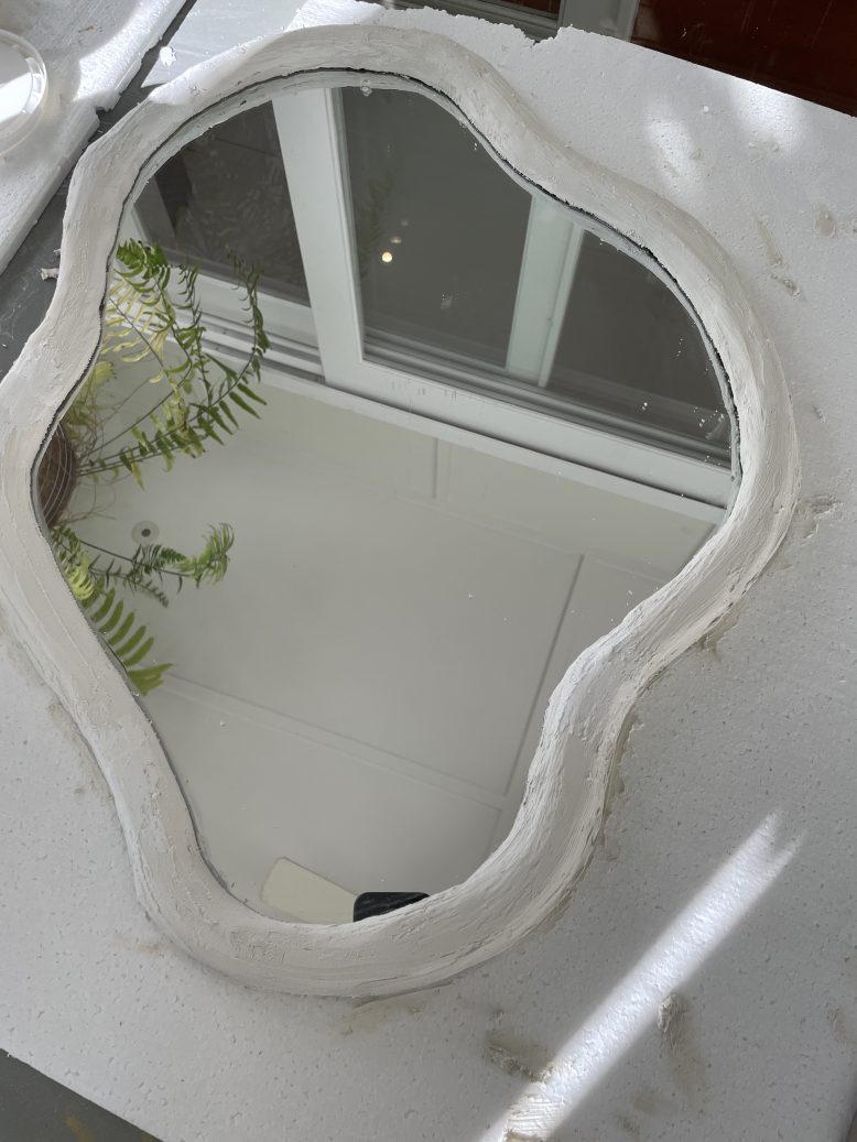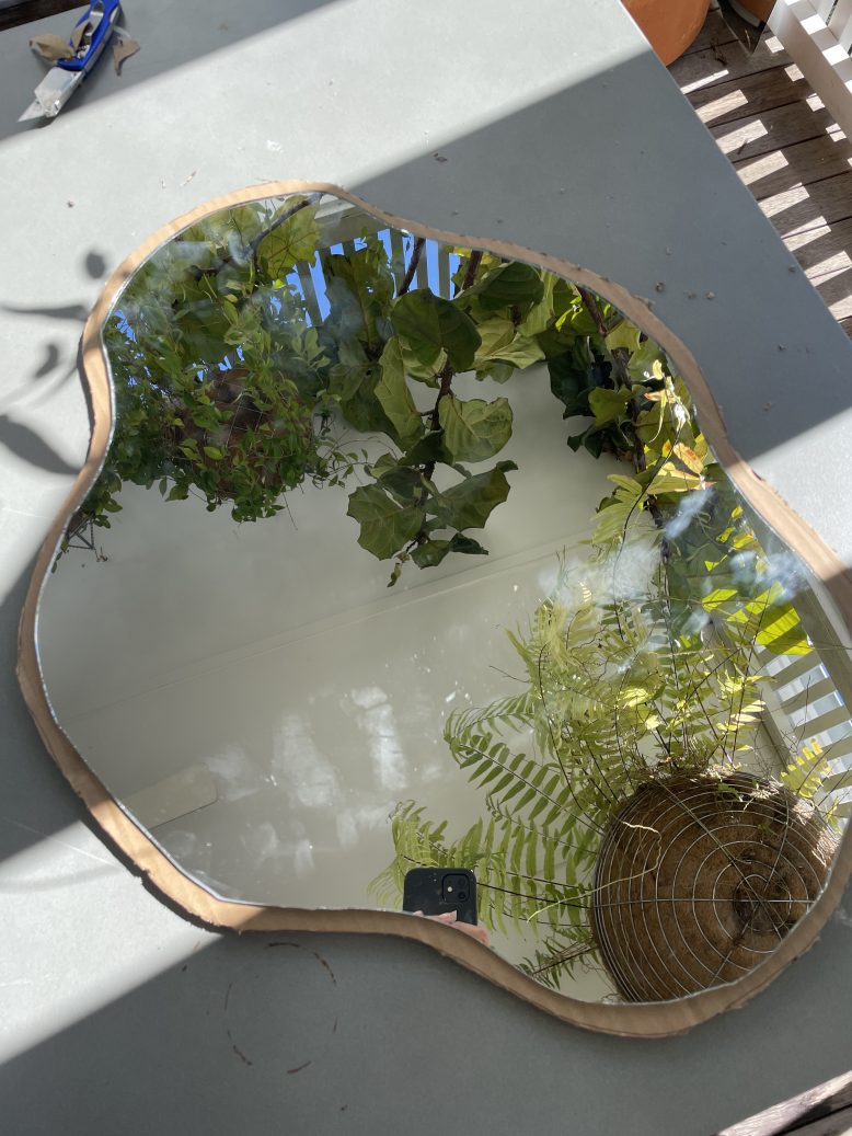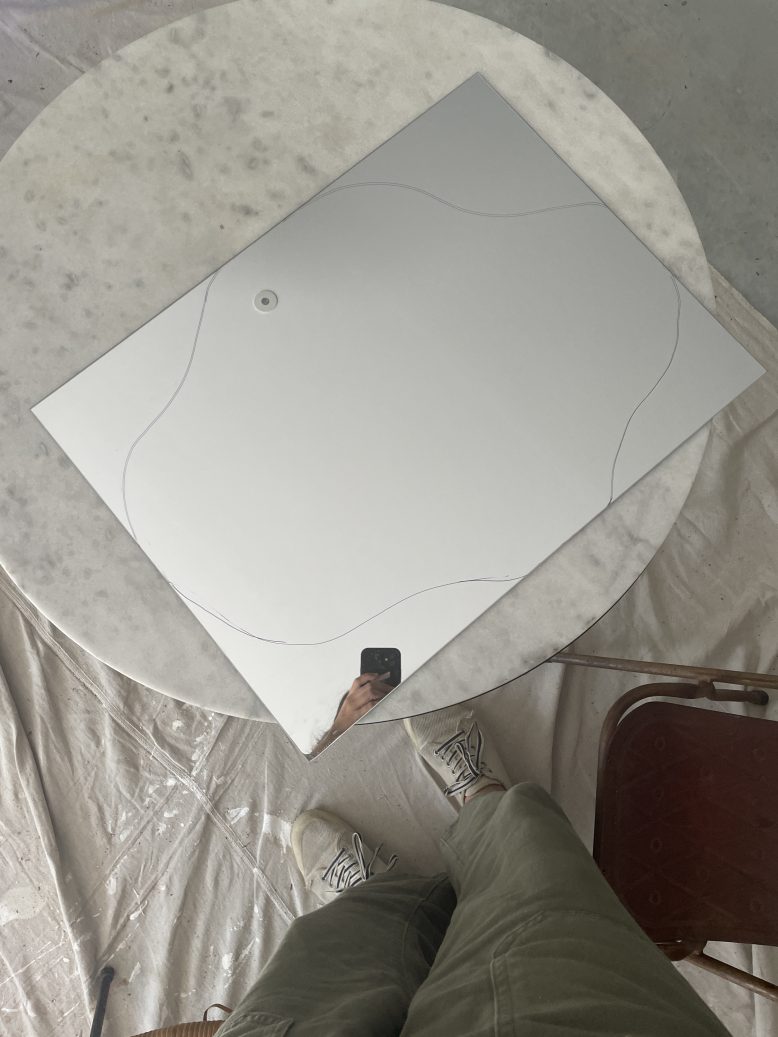 I just knew I needed to turn this $24 mirror into something more interesting. But what? I found some fun inspo pics and decided I needed to attempt some glass cutting to turn this simple mirror into a custom piece of art. I wanted something really organic – a pebble, a pond, a puddle, whatever you want to call it, I knew it was going to be a challenge but when you’re in lockdown a challenge sounds kind of perfect.