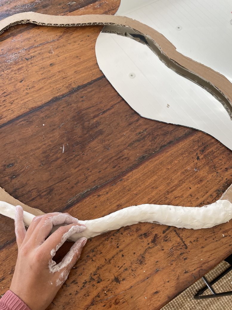 Roll the airdried clay out into long lengths and cover the cardboard frame with the clay. Make sure to round it all out for a nice finish
