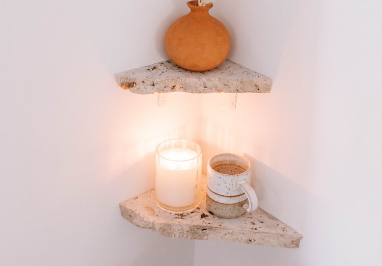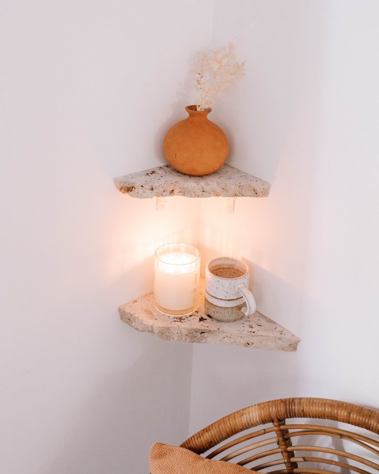 Next up, I wanted to find a way to make some stone shelves in the corner of my studio. Again, I searched my scrap pile for some triangle pieces with right angles that would sit well in the corner of the wall. I glued the tile to some wall brackets right on the edge of the straight sides. Once completely dry, I used s stud finder to find the studs in my wall, and then screwed the brackets into the wall. I also decided to grout and then paint the brackets the same colour as my walls so the blended in a little more and the stone looked more like it was floating.