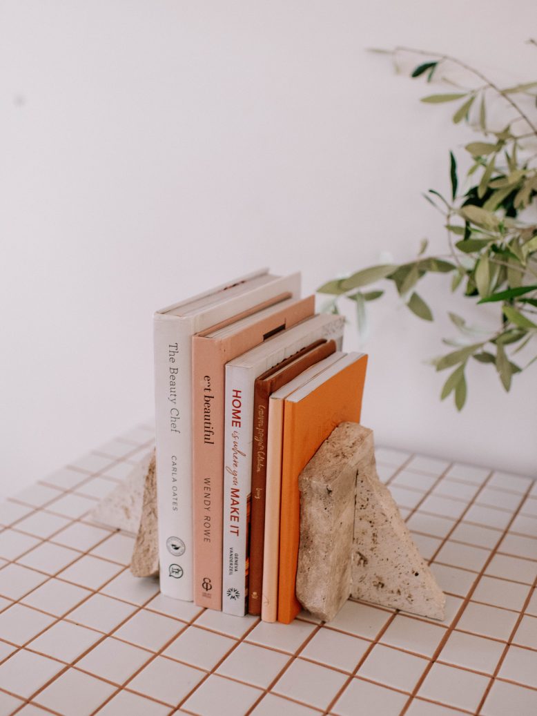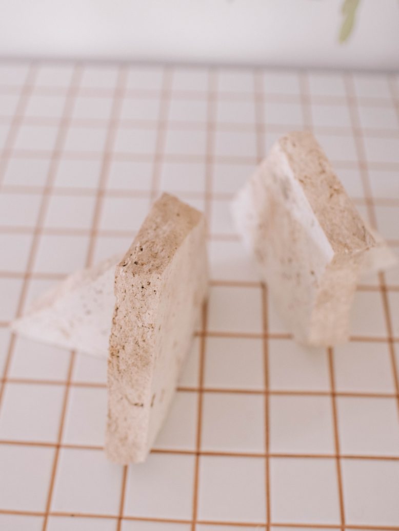 First up is a super simple book-end project that anyone can do. I rummaged through my scrap pile and found a few pieces of travertine that I liked that shape of. One piece needs to be a triangle shape and the other could be a little more of an organic shape. Where they join you need to make sure they are flat and are right angles. I got out my Selly’s glue and glued the two pieces together. I made two sets of these to create the most perfect, organic looking book ends! It’s important that you still wait the whole drying time to ensure these little guys stay together but other than that it’s seriously one of my fastest projects of all time.