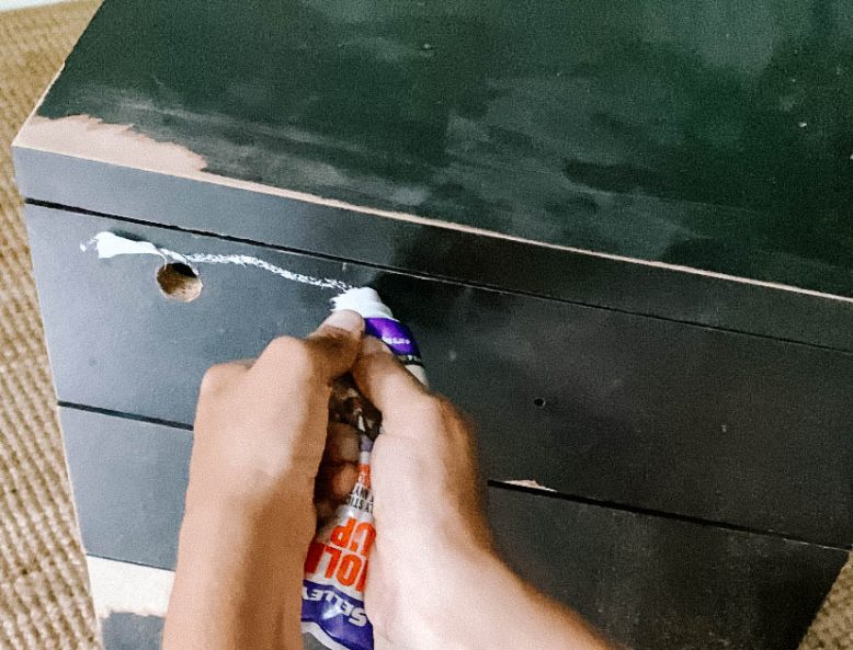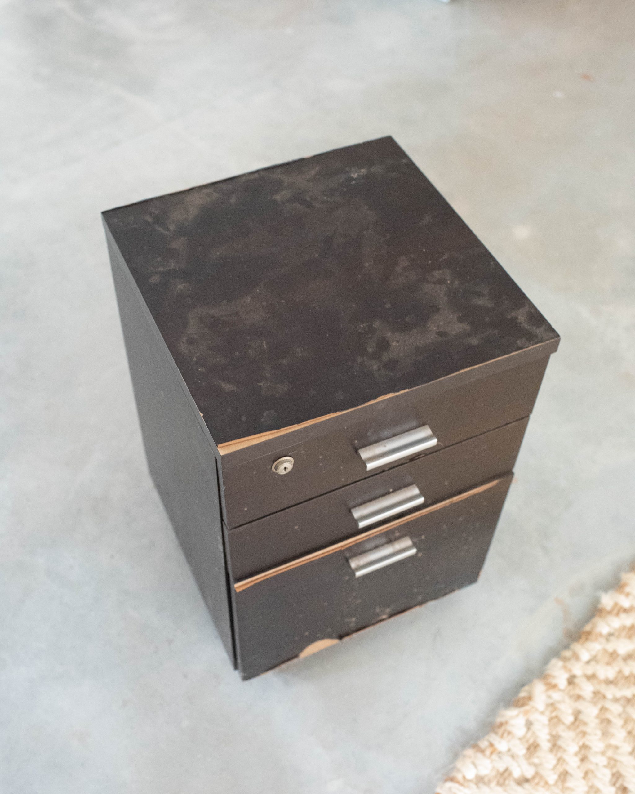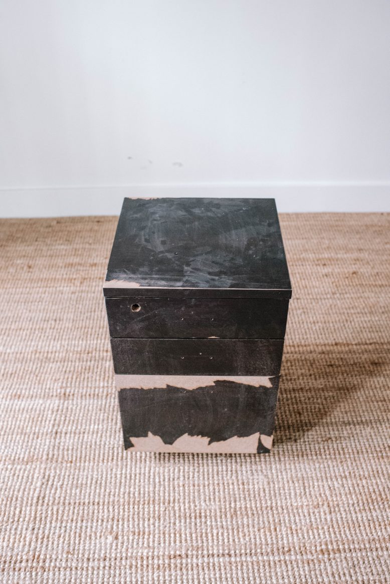 Begin by preparing your set of drawers. I removed any hardware including the little key hole. I then also glued the drawers shut, as I knew I wanted a clean, uniform shape and didn't need the drawers to open. When gluing them shut, I and also propped them out a little with glue so the front surface of the cabinet was completely flush with the top edge. This gave me a shape that was completely flat on all sides. I then sanded the drawers carefully.