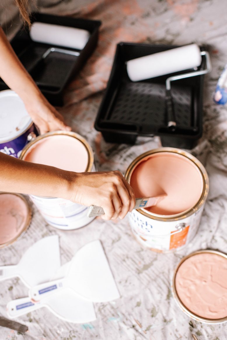 Begin by prepping your area - lay down drop cloths, tape along the floor or skirting board and give all your paints a really good mix. Having everything ready and prepared always makes the process much smoother!
