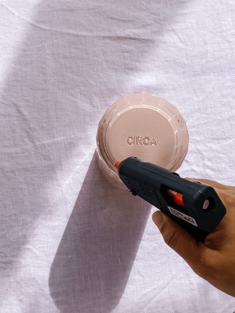 - Once the paint the dry, turn the glass upside down and put some hot glue over the base of the glass.