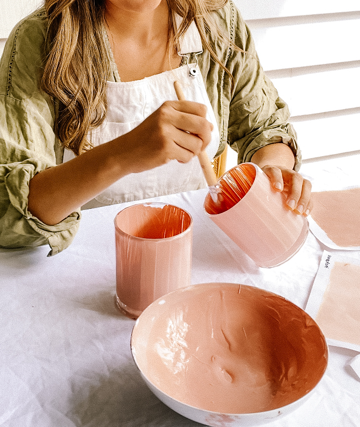 - Once clean and dry, paint the inside of the glass with paint that matches the colour of your plate. I mixed a pink colour to perfectly match.