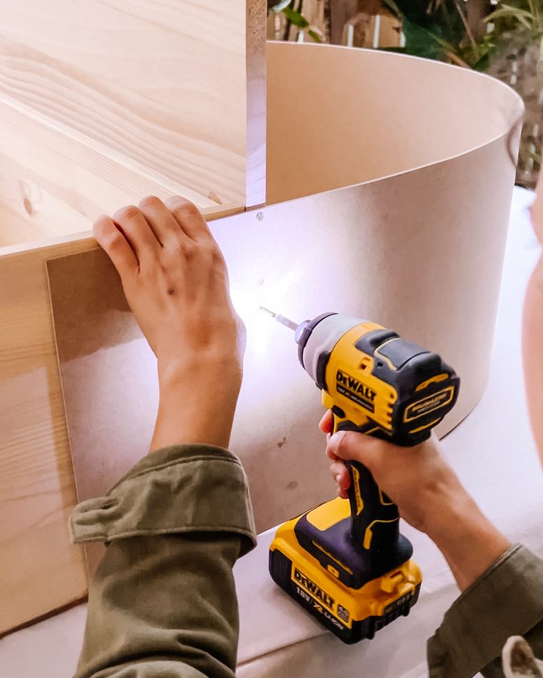 Once the base of the desk was assembled, I attached the MDF to one side of the drawers then pulled it around, carefully bending it to attach to the other side and create an arch.