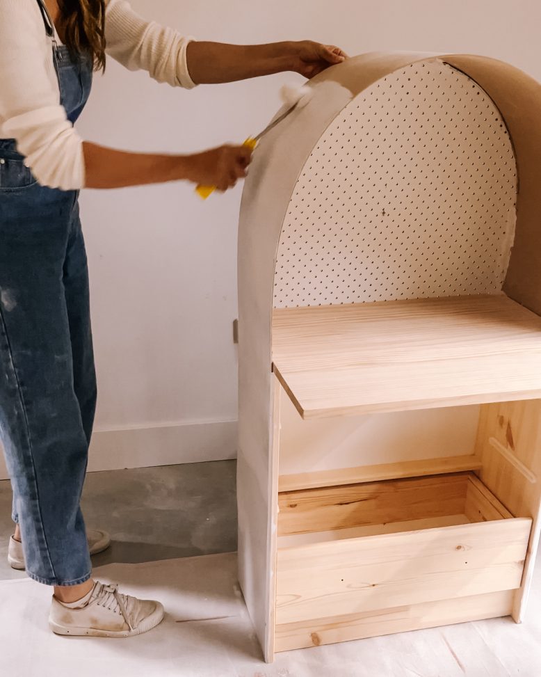 I screwed it into the side, and used some glue to attach the pegboard arch to the arch. I added another piece of MDF to go down the sides of the drawers and used filler to disguise the joins and the screws.