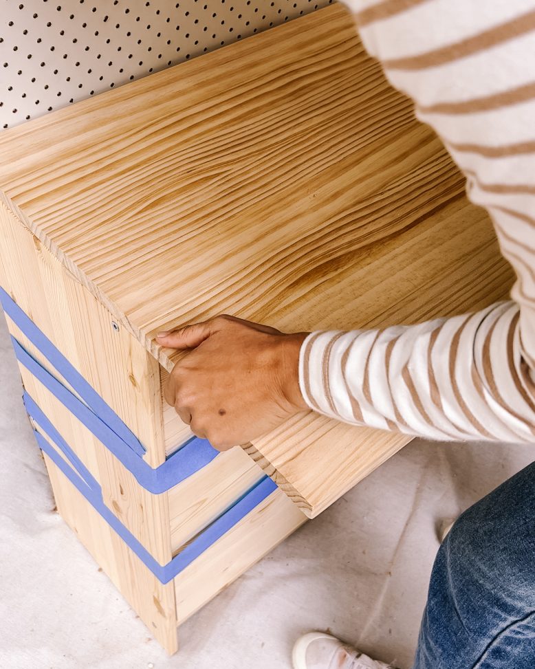 Once I had all the pieces cut to length, I glued the peg board to the back of the chest with Liquid Nails and then glued the pine panel to the top of the chest as the desk’s top.