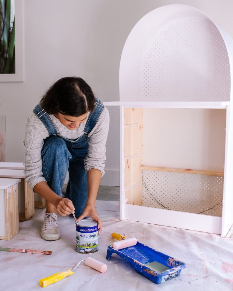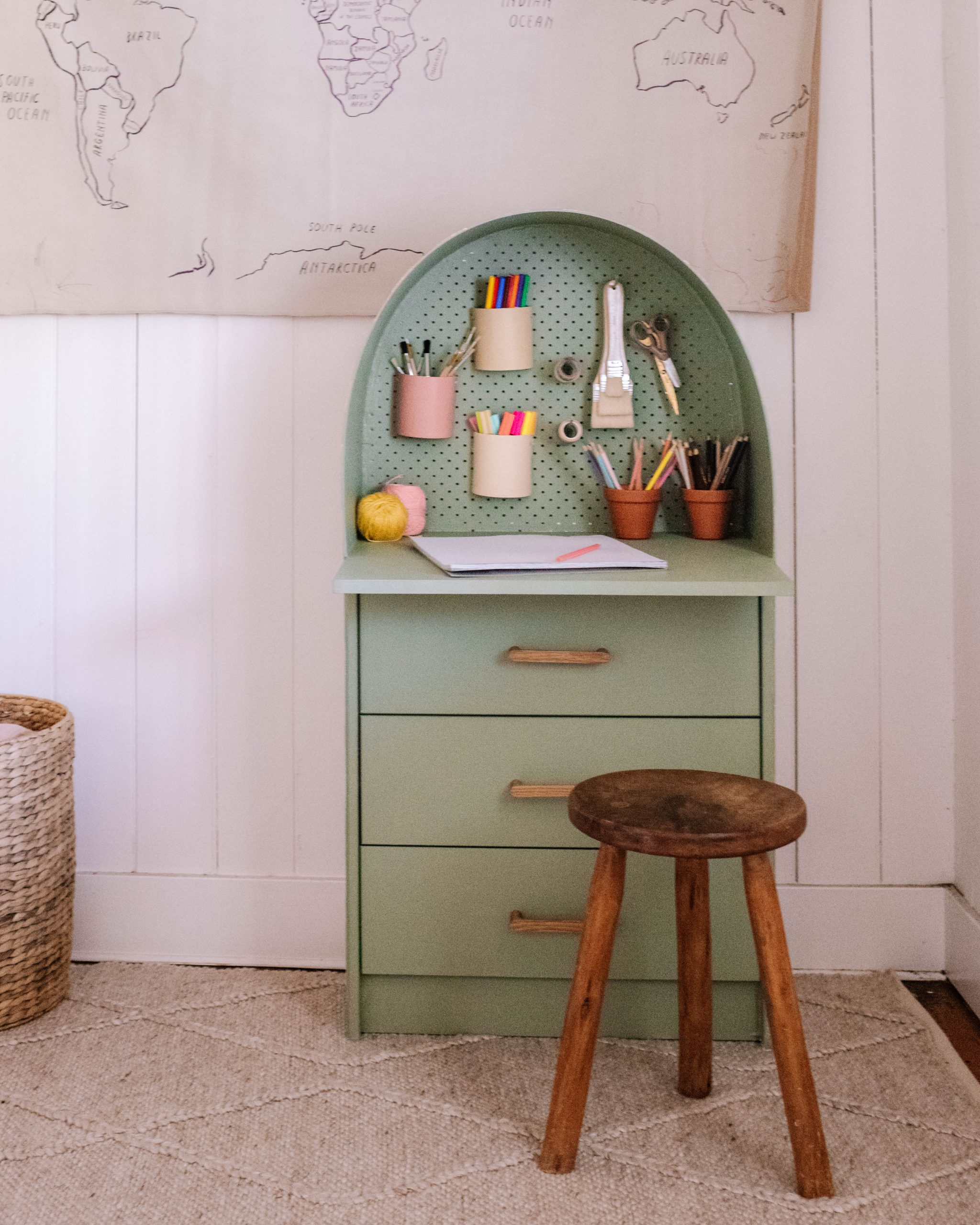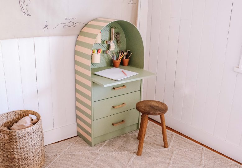 Recently we put the girls into the same bedroom, and created a playroom in the spare room. There’s a blank space in the corner and I wanted to add an art desk where the two of them could colour and paint. The only problem is that most children’s desks are made from bulky plastic, have little to no storage and just aren’t very cute. So of course, I had to make one that checked all my boxes!