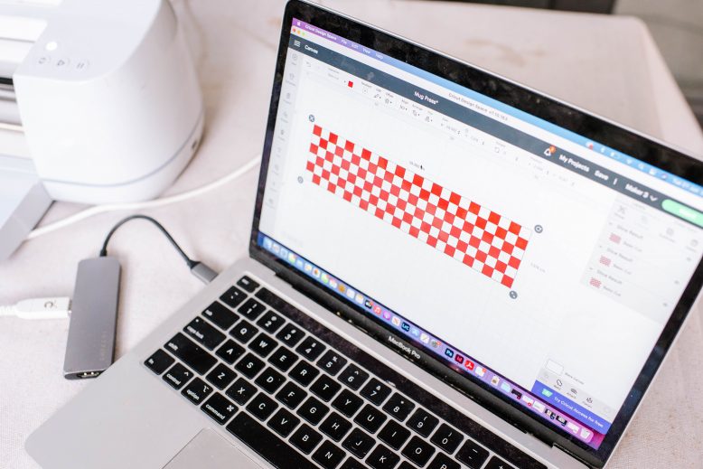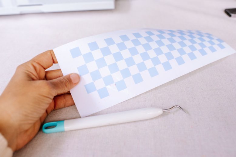 For this project I used the canvas in the Design Space app, and simply searched in the image library for a checker pattern. I used ‘Chess Board #MBD5D0BE’. I then measured the circumference of the carafe and glasses and made designs that would fit perfectly by duplicating the image and attaching it together. You can access my design here (Cricut have a new profile function so I’ll be adding most of my projects to that!). Note that you will need to measure your glasses and resize the design to fit. Use the slice button to remove any sections you don’t need.