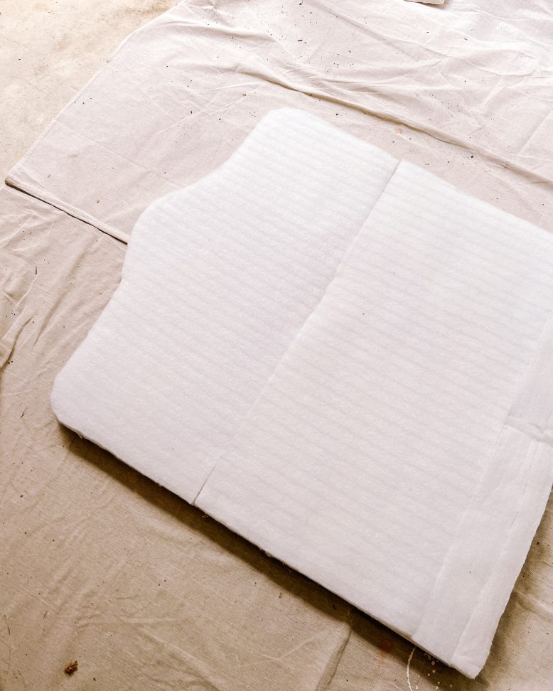 I removed the covered from the bench seats, and found that they had foam also batting, both of which I would could use. I then laid the wooden headboard down onto the foam piece and traced out the shape.