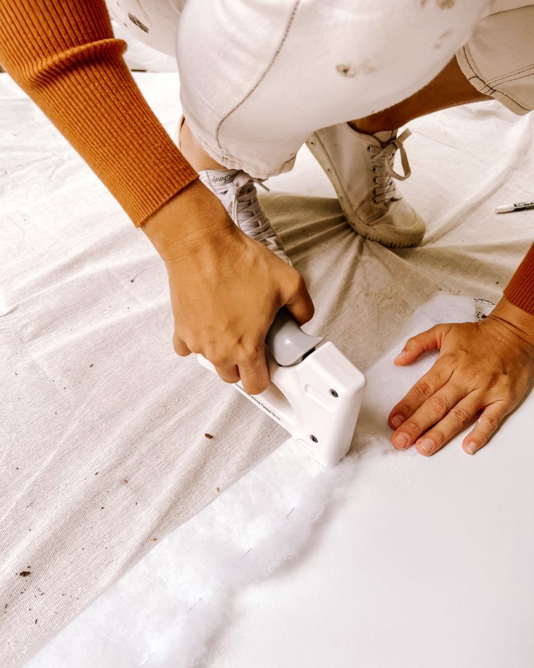 After the liquid nails had dried, I secured the foam batting around the foam side of the headboard and stapled it at the back so it was taut around the front of the foam. Because the baiting was in strips, I used a spray adhesive to attach the edges.