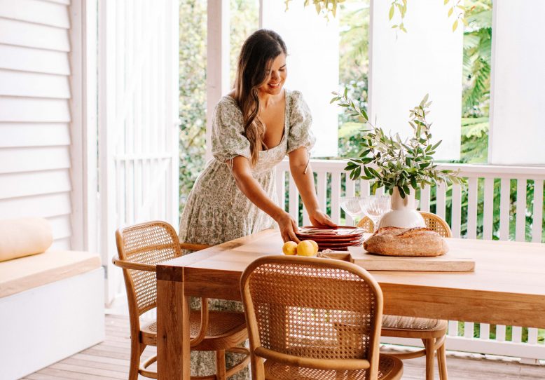 We’re very lucky in that our back deck closes up quite well and is pretty sheltered from the elements, and since we don’t have a dining table inside, we love having a beautiful dining table on the deck. The sliding doors are open almost year round and the deck becomes like an extension of inside, so I like to have furniture that feels cosy and not too ‘outdoorsy’.