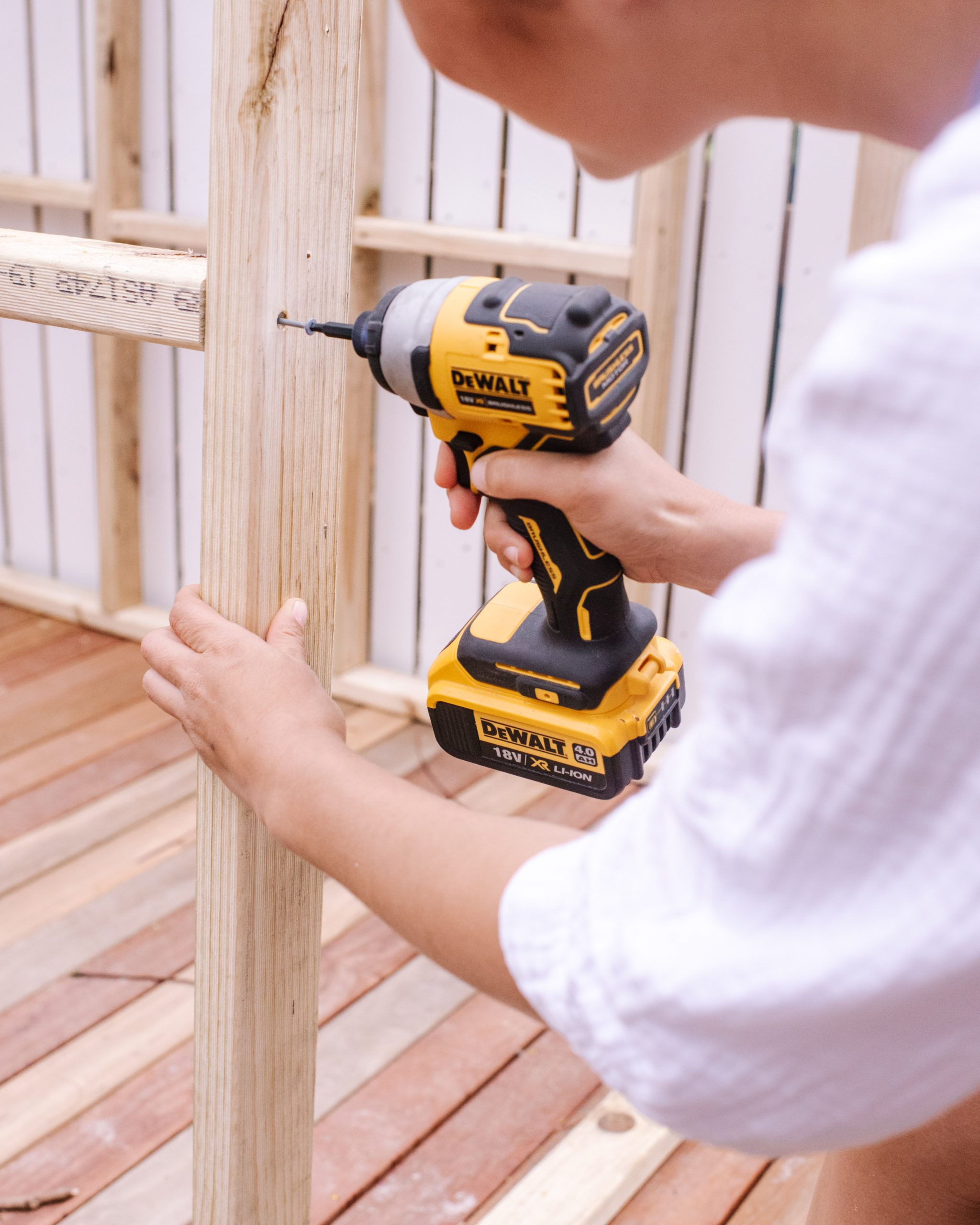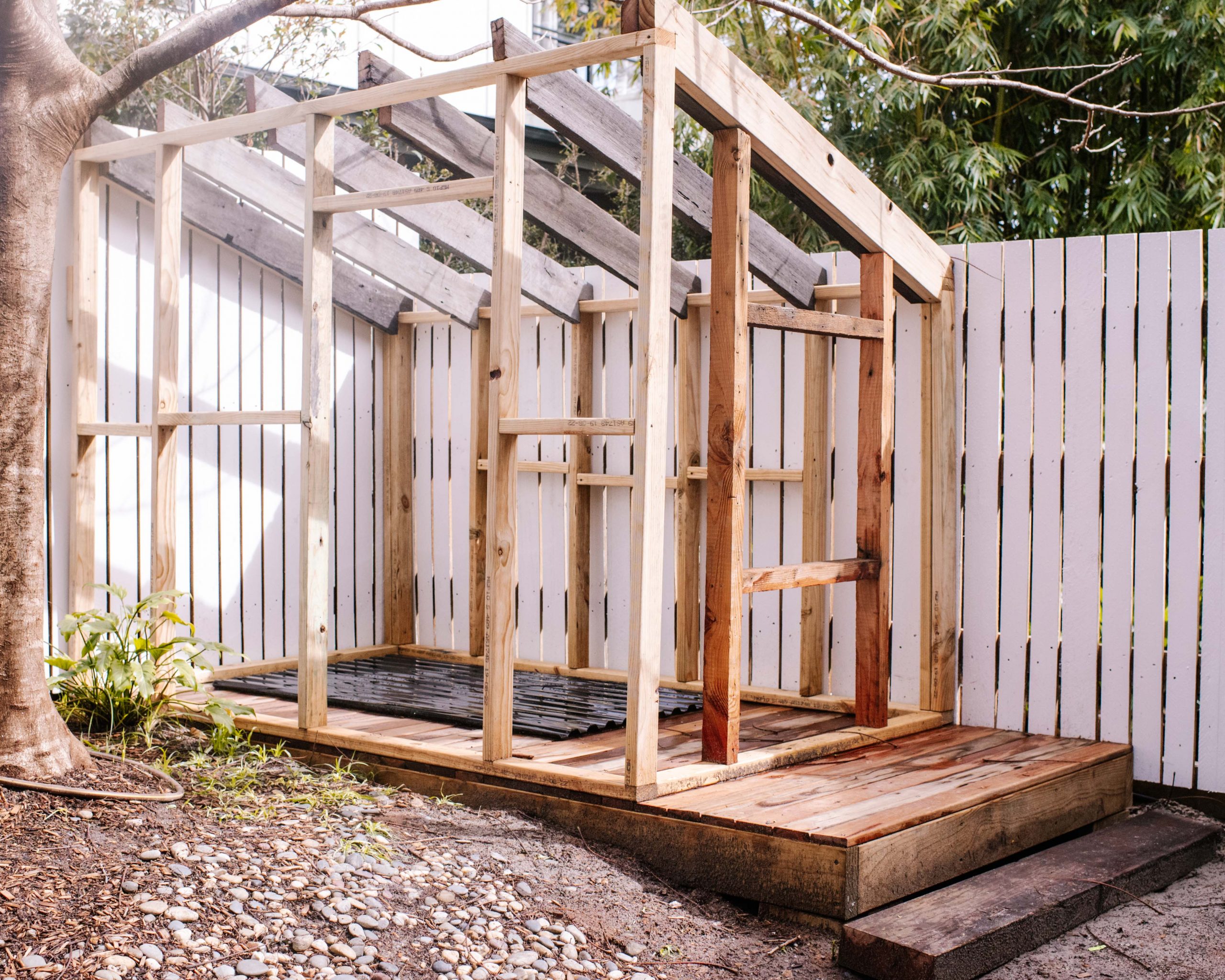 When building the structure of the clubhouse, we first built a flat deck section in the garden and then we created a frame using secondhand timber. We ended up needing to dig into the ground a bit and used a couple of pavers to make sure it was level as our back garden has a bit of a slant to it. To clad the outside, we had some plywood spare so it was really simple to just cut it into strips and nail it directly onto the frame. To make sure the play house was “little legs friendly” we ended up adding a timber step in front of the deck which we had left over from the other steps in our garden.