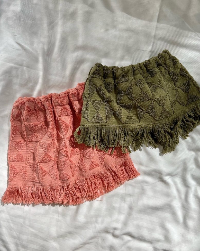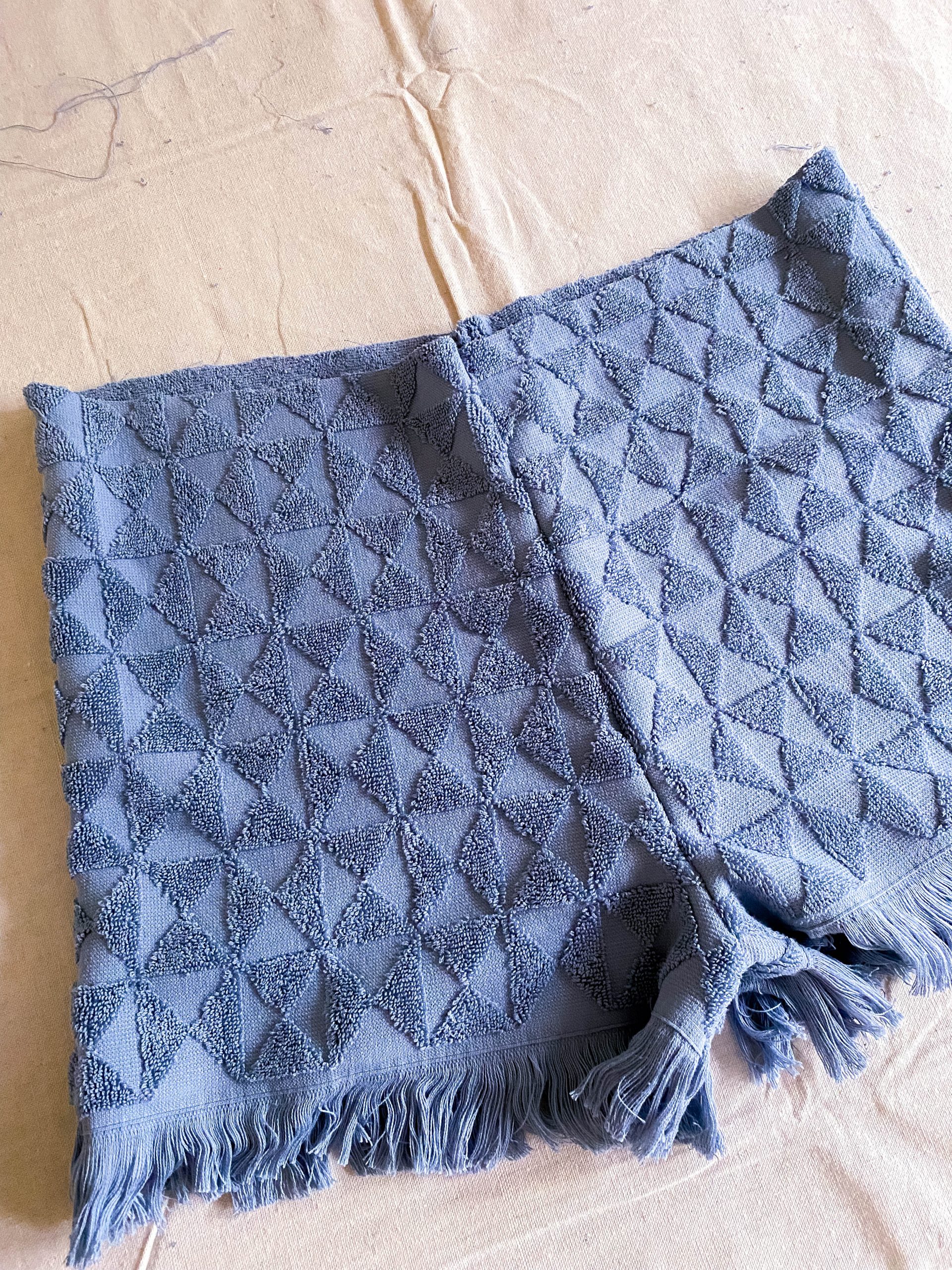 I worked out the style I loved was from the brand Lucy Folk, they have the robes, shorts and these really cute skirts. Once I found the style, I needed to find the material. Luckily there are so many cute towels on the market these days, I headed to Pillowtalk and found these really affordable towels. I think with this type of project, looking for towels with unique patterns and textures is really important. The ones I picked out also had a tasseled edge which I think added a really fun detail and meant I didn’t need to hem and of the bottom edges – bonus!