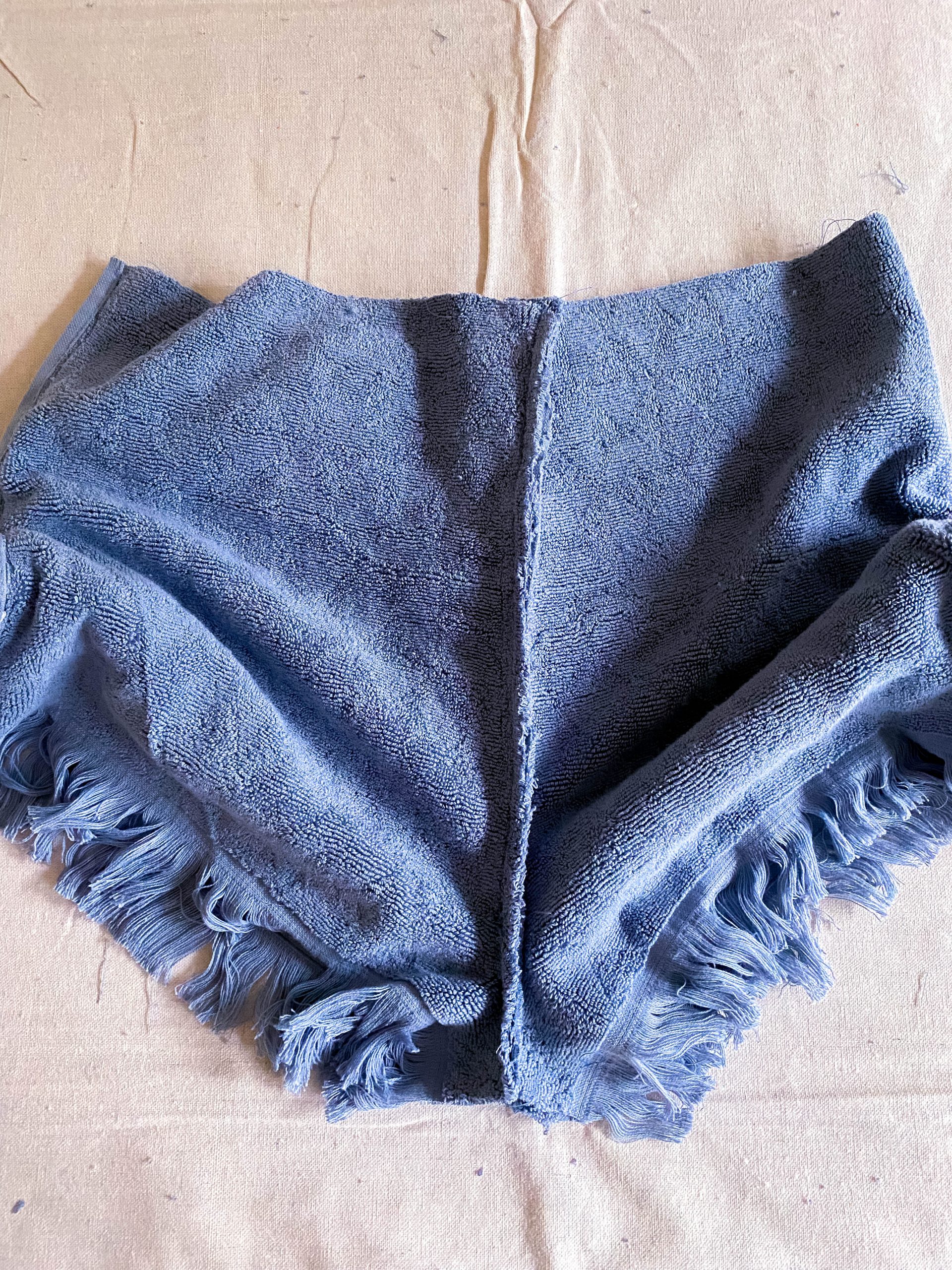 For the shorts I used my trusty shorts tutorial (ten years old from here!) and I just went with very basic construction. The main thing I focused on was aligning the pattern with the edge of the towel to give a frayed hem. Basically for this project you use a pair of shorts that you own as a basis for the pattern, and cut the pieces out of towel.
