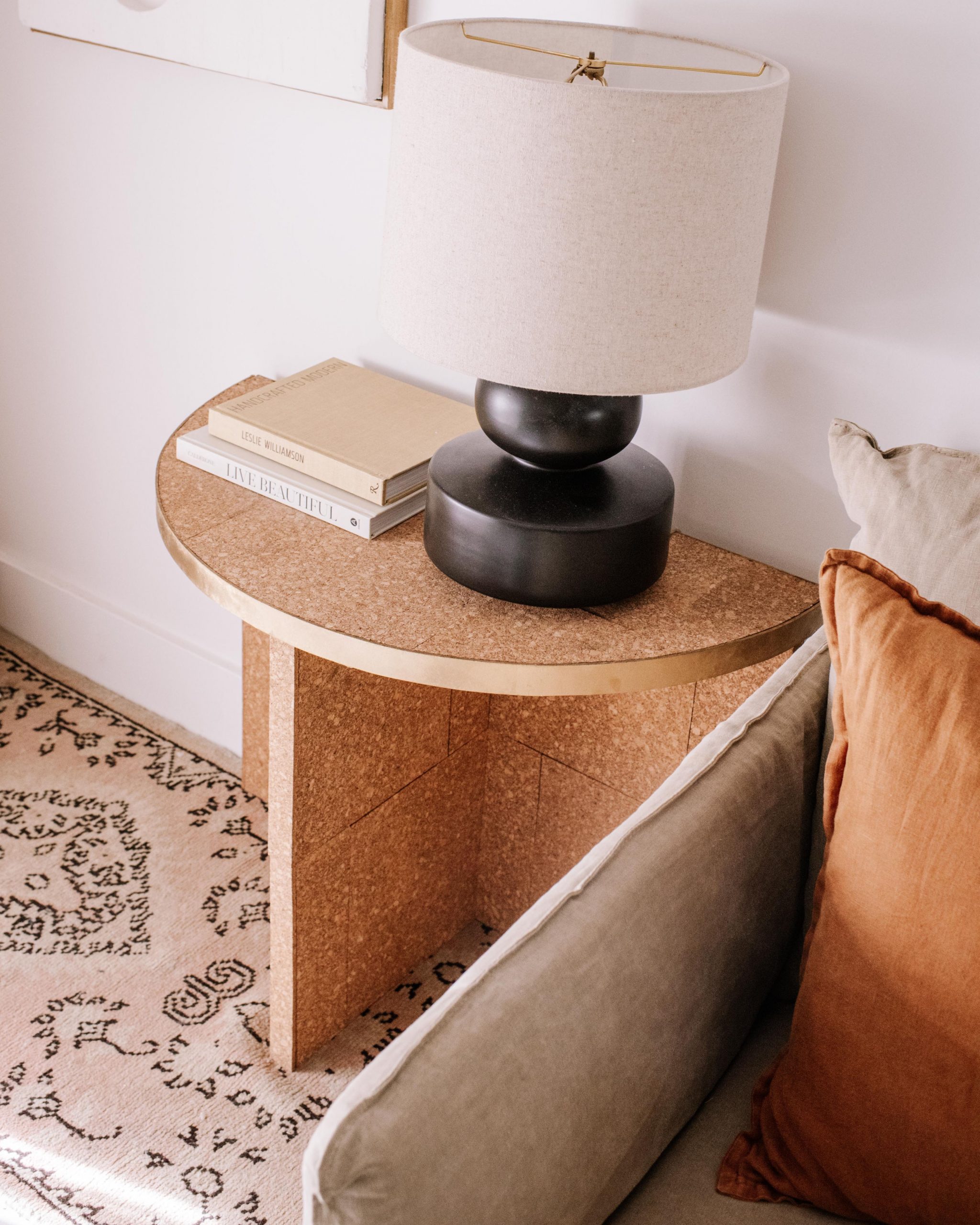 One of the things that I find often is basic laminate furniture that’s dying for a refresh. There are so many options out there but I have been really into mid century materials – warm wood and cosy cork, so I decided to use cork tiles to give this piece a full makeover. Coming in at under $70, I felt like this project is a really affordable and effective way to completely change the look of a piece!