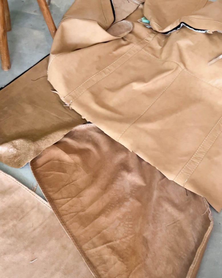Once I had the pieces cut off, I organised them into what sections I would use for what parts of the daybed. Initially I wanted to do strips cut up and then sewn back together but I realised I didn't have enough pieces wide enough, so in the end I decided to go with a larger section of leather along with some canvas. I needed enough to cover the 57cm x 49cm foam cushion for the end for the day bed and the bolster cushion.