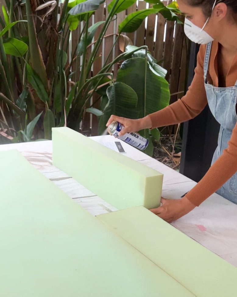 For the foam for the cushions, I used a bit of a hodge dodge of foam I had to create the right size foam. I used spray adhesive to connect the foam pieces. I ended up with two pieces of foam. One was 57cm x 49cm and the other was 57cm x 95cm.