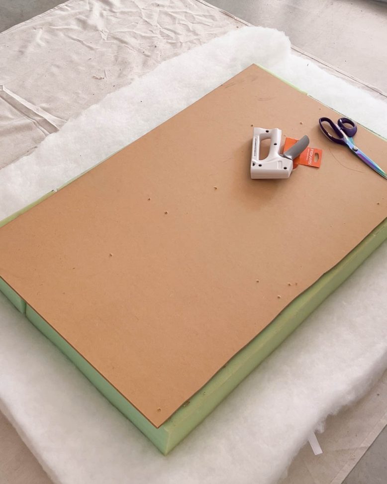 Once I had the fabric measured and cut, I cut out a piece of MDF board to go on the bottom of each foam cushion which I will use to staple the fabric into to give the piece a nice clean upholstered look.