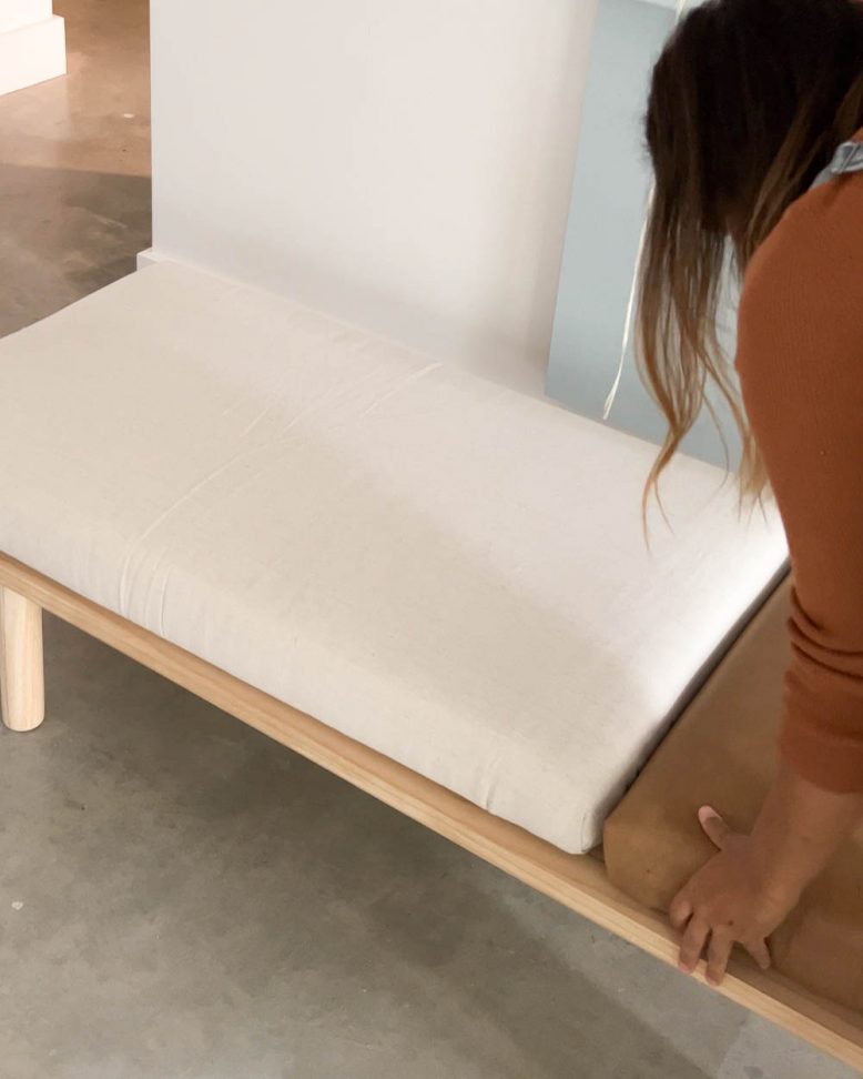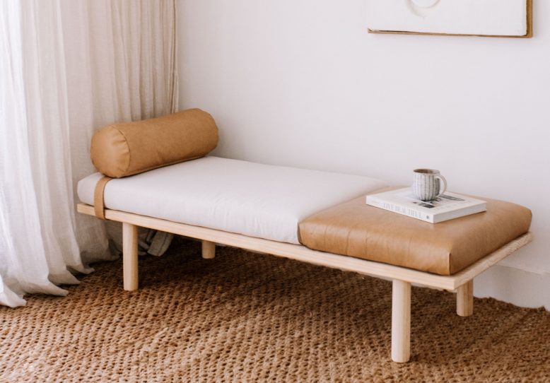 I’d been wanting to make a cute daybed for my studio for a while, and realised that with some salvaged leather this could be the perfect project. I ended up salvaging as much of the leather as I could, to use as the material for my final #FoundThenFlipped project. Using a piece of wood and screw-in furniture legs from Bunnings I was able to create this little daybed for my studio, complete with leather cushion and DIY leather bolster. Read on to see how.