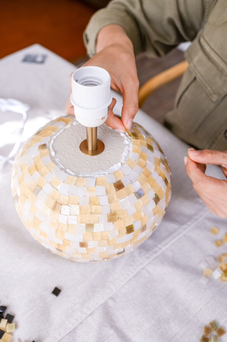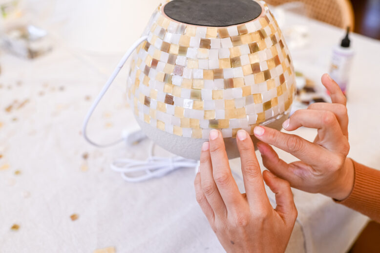 I continued glueing on all of the tiles, moving my way down the lamp. I made sure that the patterned stayed random and that each line was not perfectly straight. Once I got closer to the bottom, I turned the lamp over and finished it off. I then allowed the glue to set for an hour.