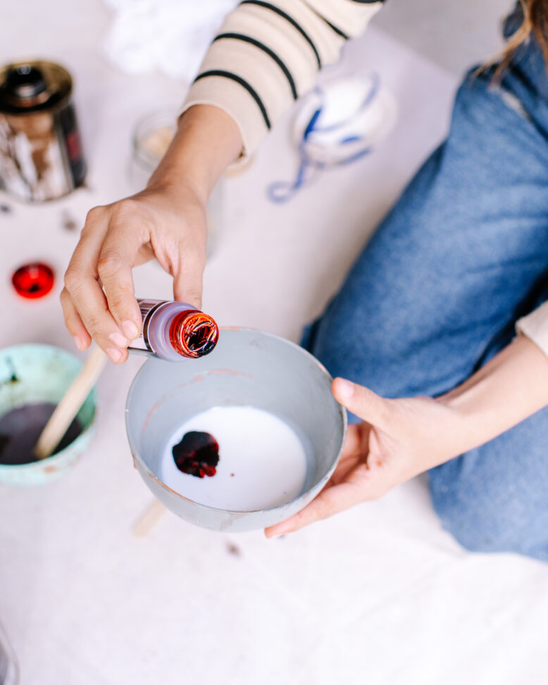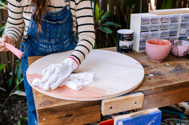 As soon as I heard about this idea I immediately pulled out my Prooftint stains and started experimenting with all the colours. According to Feast Watson you need to add around 5% of the stain to the Liming White to tint it into a colour, but I simply experimented with amounts to get the colour I liked. I found a few drops in a cup seemed to work well. I was so shocked and ended up creating some seriously cool shades of pinks, yellow, purple and grey. One of my favourite things about DIY is the experimental phase, mixing different ratios and creating all the colour swatches to see what’s possible and make something new. You can find the colour chart on the Bunnings website under Liming White which is really good place to start, and I recommend having a play around yourself to see what shades you can make.