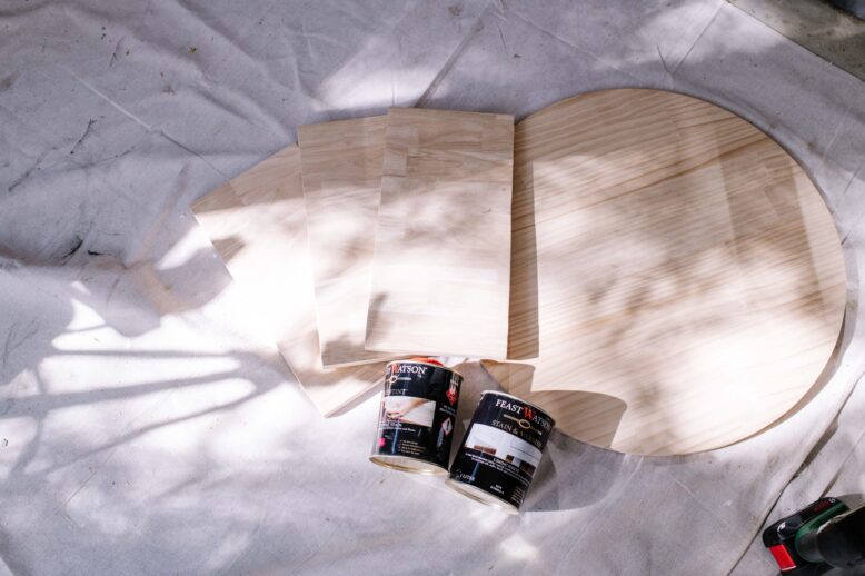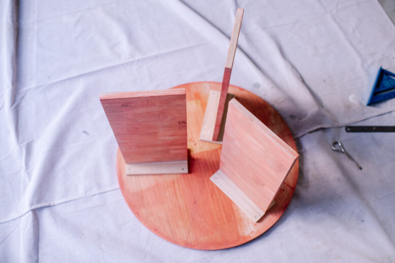 Once I had a colour I loved, I cut all the wood for my table so it was ready for staining. I had an existing circle so I used my jigsaw to cut 3 pieces of wood to make the legs. These were roughly 200mm by 400mm. I also cut 3 smaller rectangles 200mm by 90mm) to use to attach the legs.