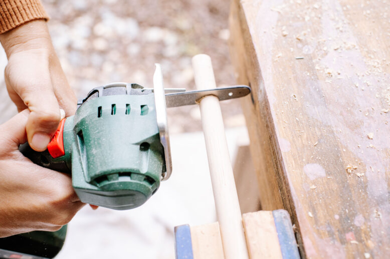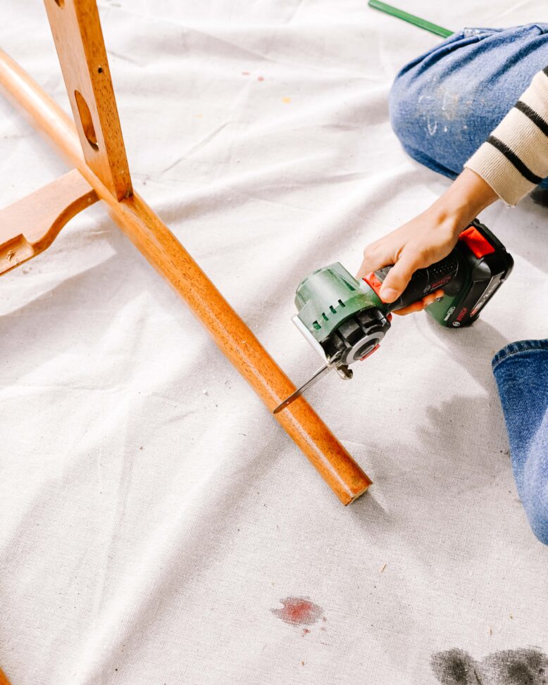 I’ve been super into arched chairs and I recently realised that it’s possible to create your own using very simple chairs that I feel like are everywhere and perfect for an update. Updating these old, drab chairs was so easy and seamless with the use of the Bosch NanoBlade, I used it to cut down the backs and then cut up the dowel to reattach them. After this I sanded all of the chairs and gave them a fresh stain. The Bosch NanoBlade is so easy to use and is perfect if you’re just getting started as a DIYer, as it’s perfect for small cutting jobs in both the home and the garden.