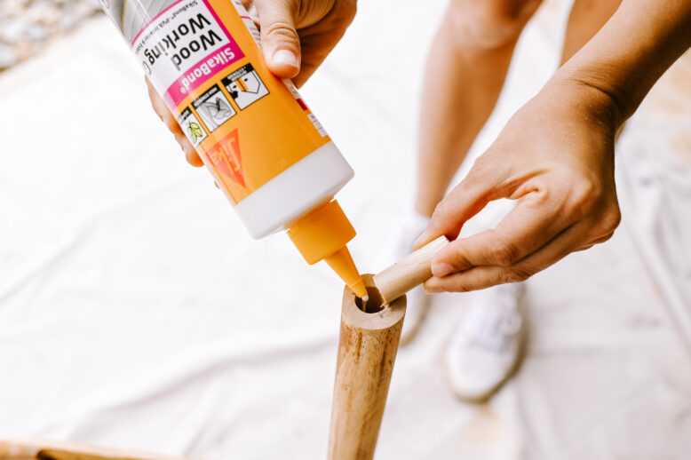 I then added some wood glue in to the holes on the chair and pushed the dowel pieces inside.