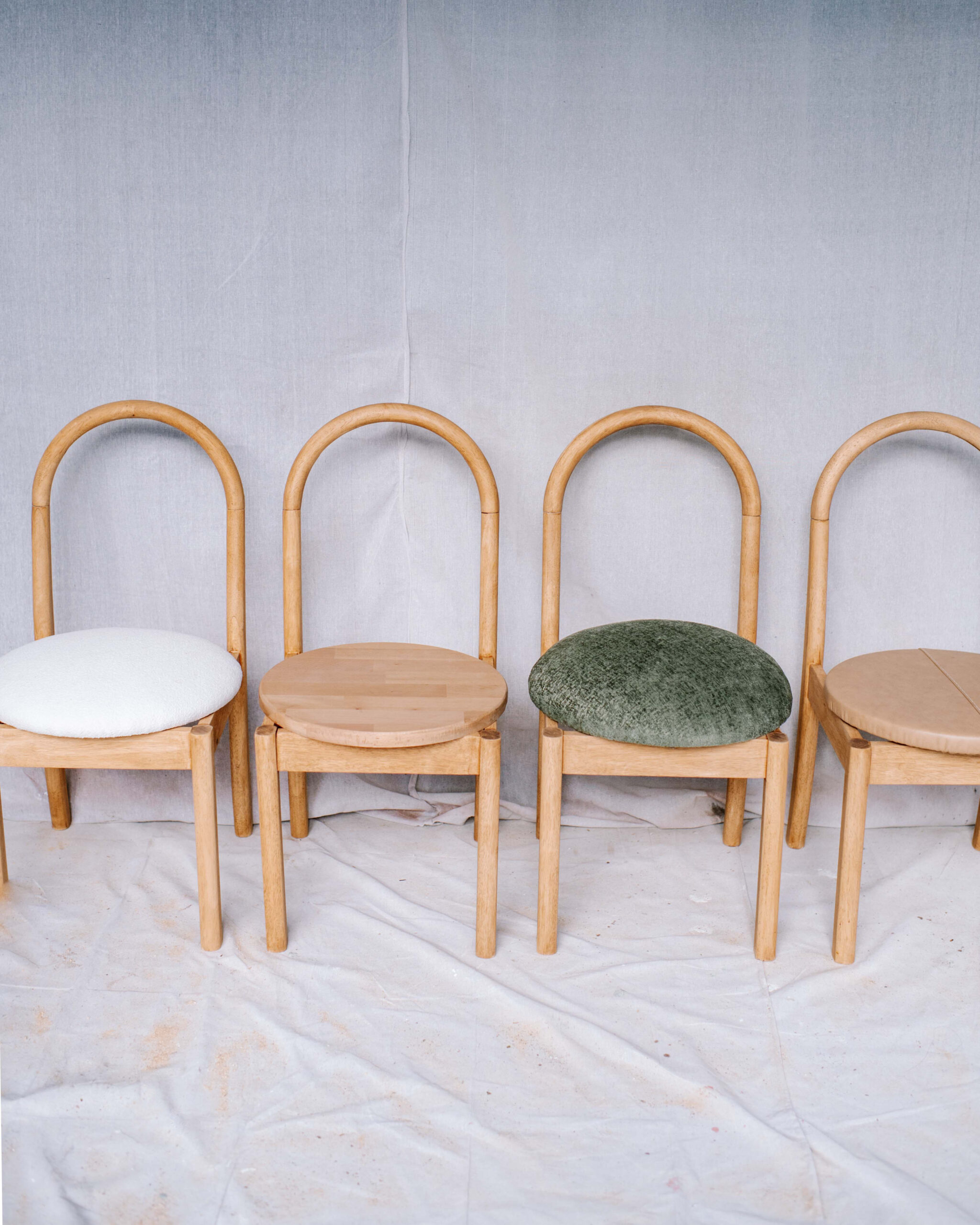 For the seat of the chairs, I wanted a really modern look so I decided to replace the rectangular seat with a round seat. I simply used a round panel of wood and did a few options: one recycled leather, one in green velvet, one in white boucle and one wood option with no upholstery. To finish, I screwed the seats in from the underside using the original holes and screws.