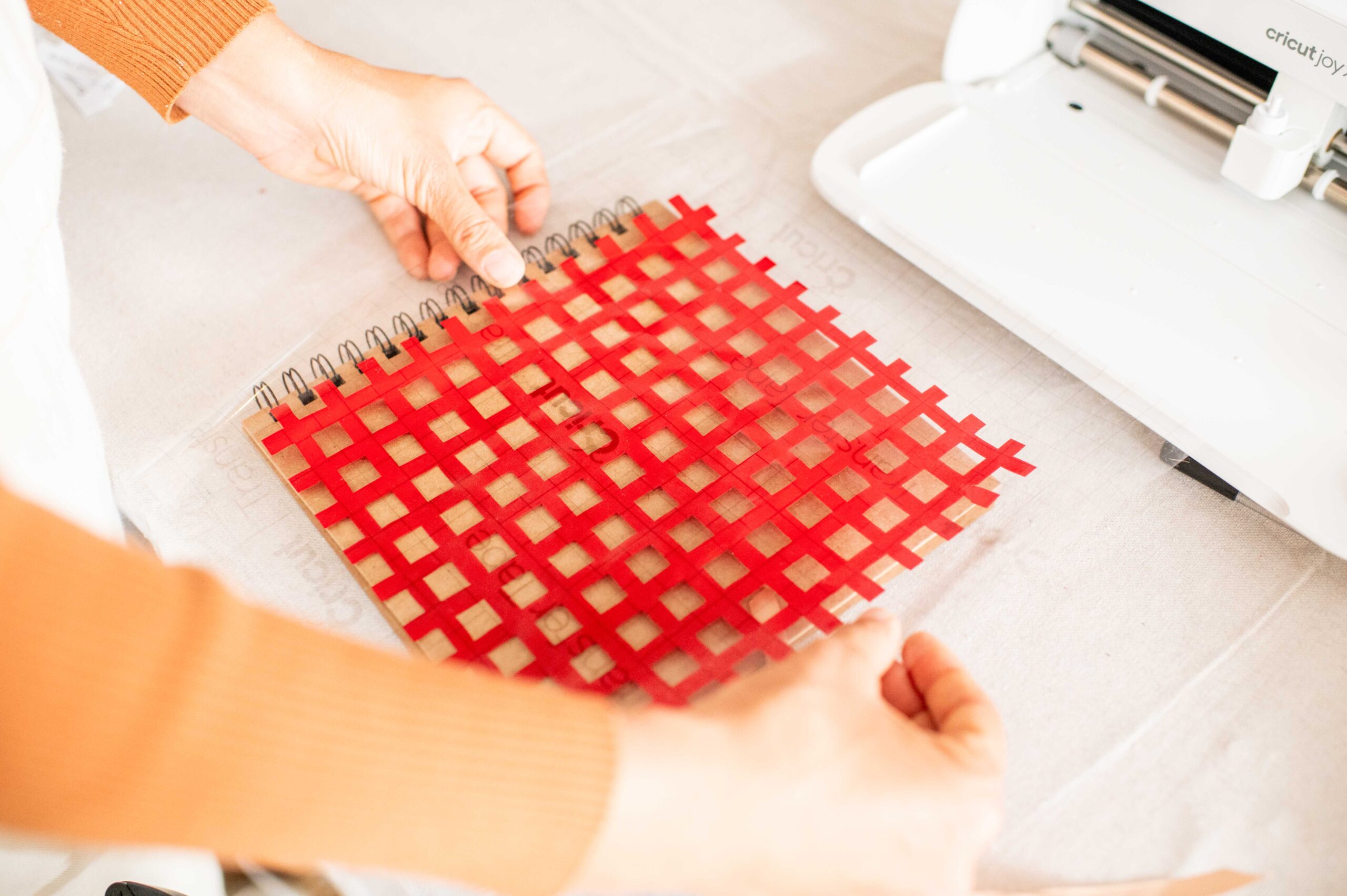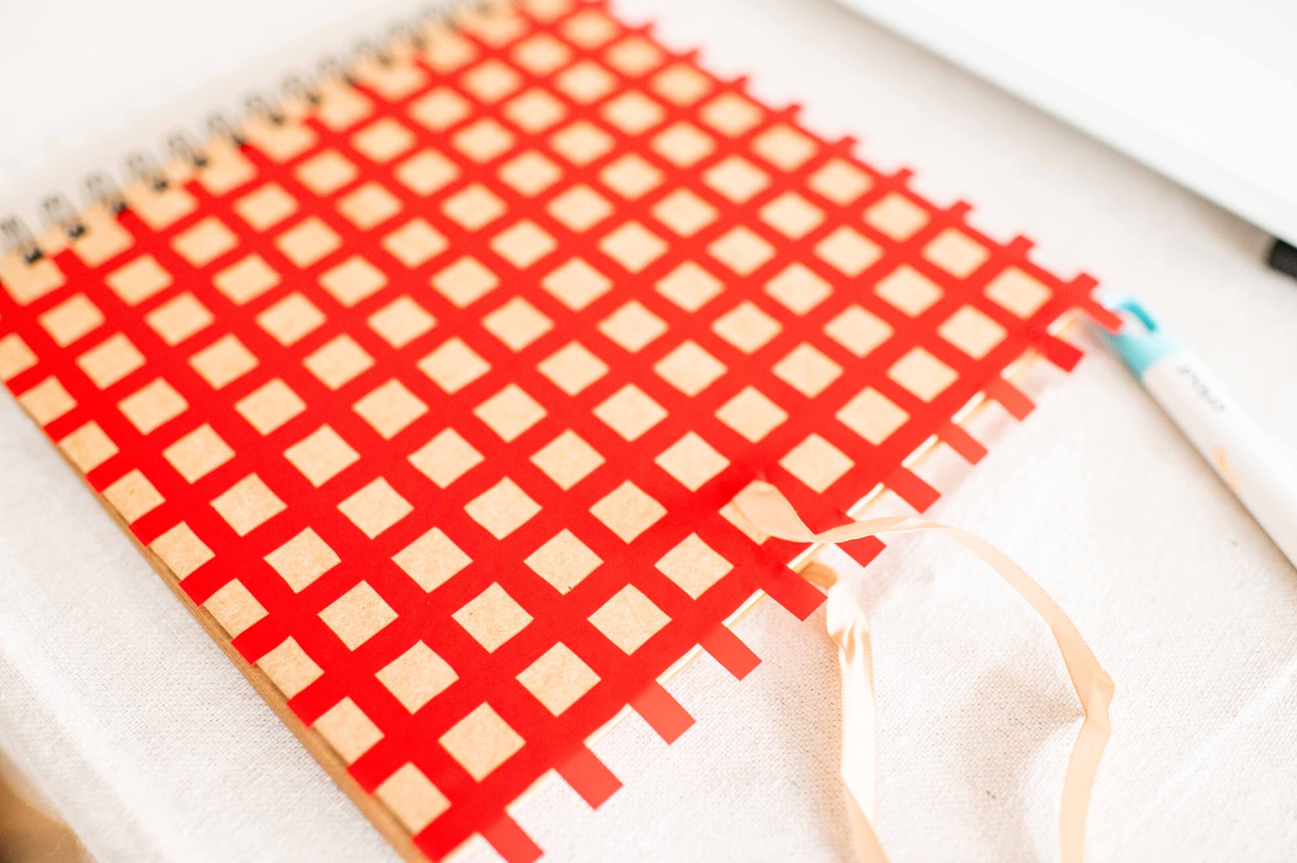You can load your materials into the machine and follow the prompts in design space to cut all your materials. Once cut, I simply transferred the vinyl gingham onto the cover and then added the circle and lettering on top. It was so easy!