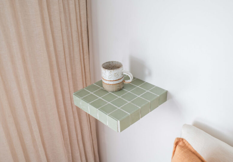 - Once the tiles have dried you can attach the wall hardware to the wall and then slide the floating shelf on. You can also use these as cute trays on a table or cabinet!
