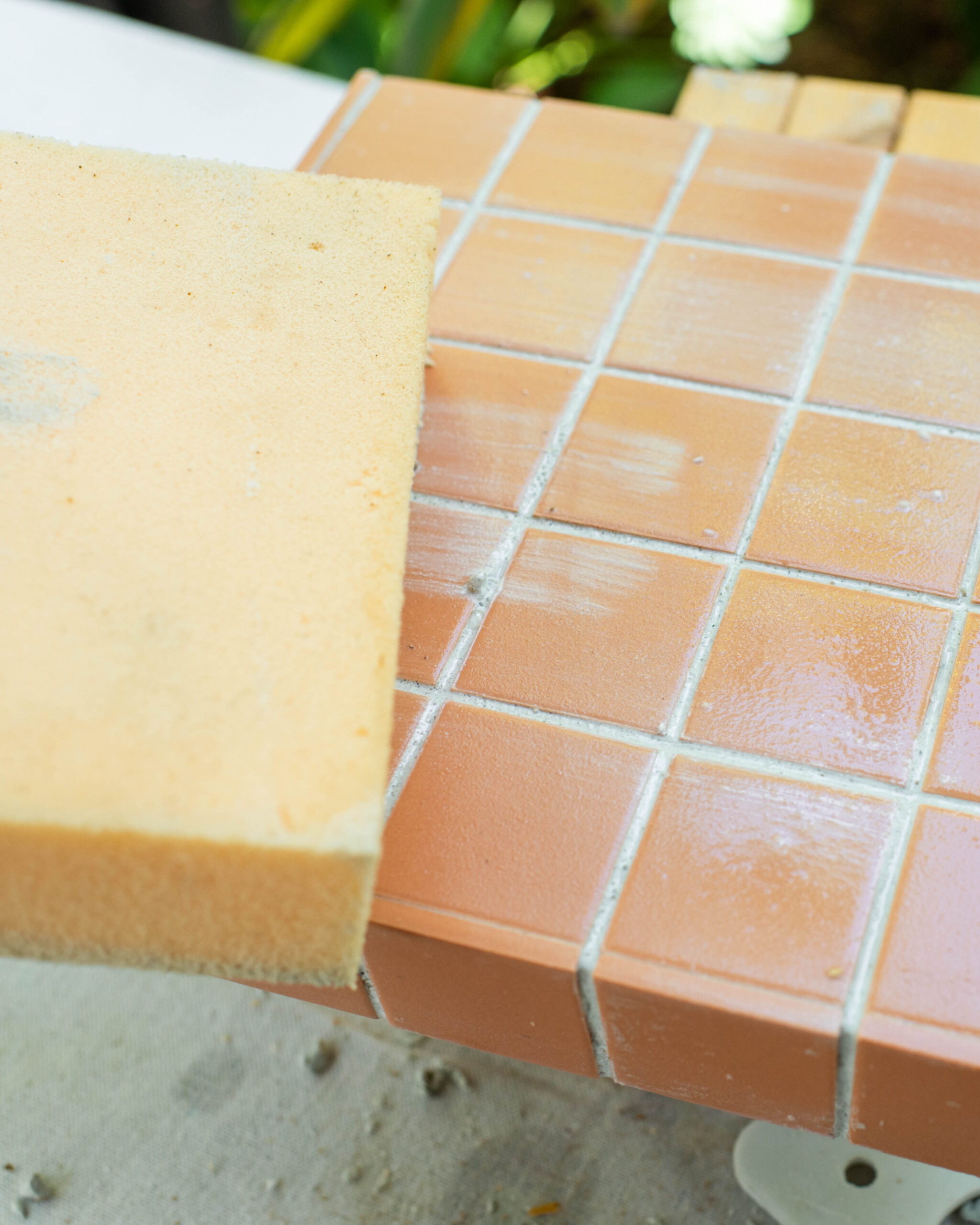 - Using a wet sponge, carefully remove the grout from the surface of the tiles. You can let the grout dry for 15 minutes before doing this so it’s less likely to pull from between the tiles. You’ll find you may need to repeat this step a few times to fully remove the grout from the tiles.