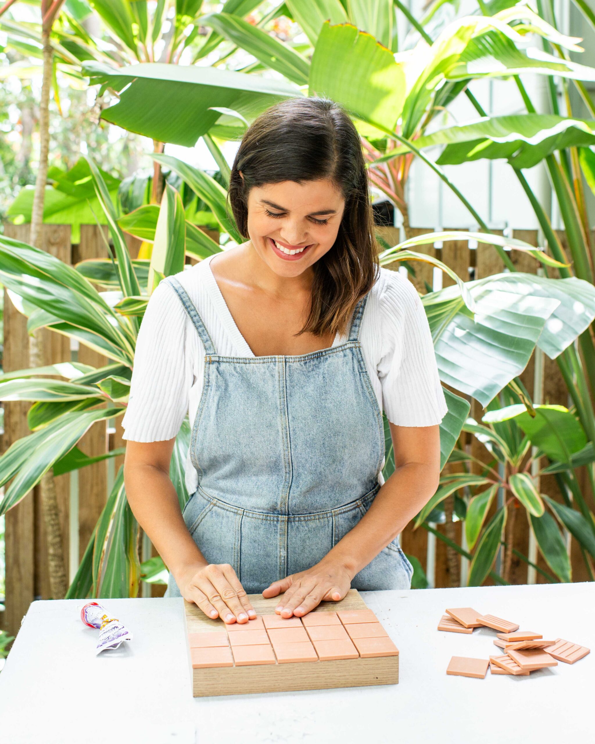 - Start by laying your tiles out on the base to check that fit well. Once you’re happy with the layout and how the corners come together (this can take a bit of thinking!) use tile glue to glue them down. Allow that to dry overnight (or based on the drying time of your glue).