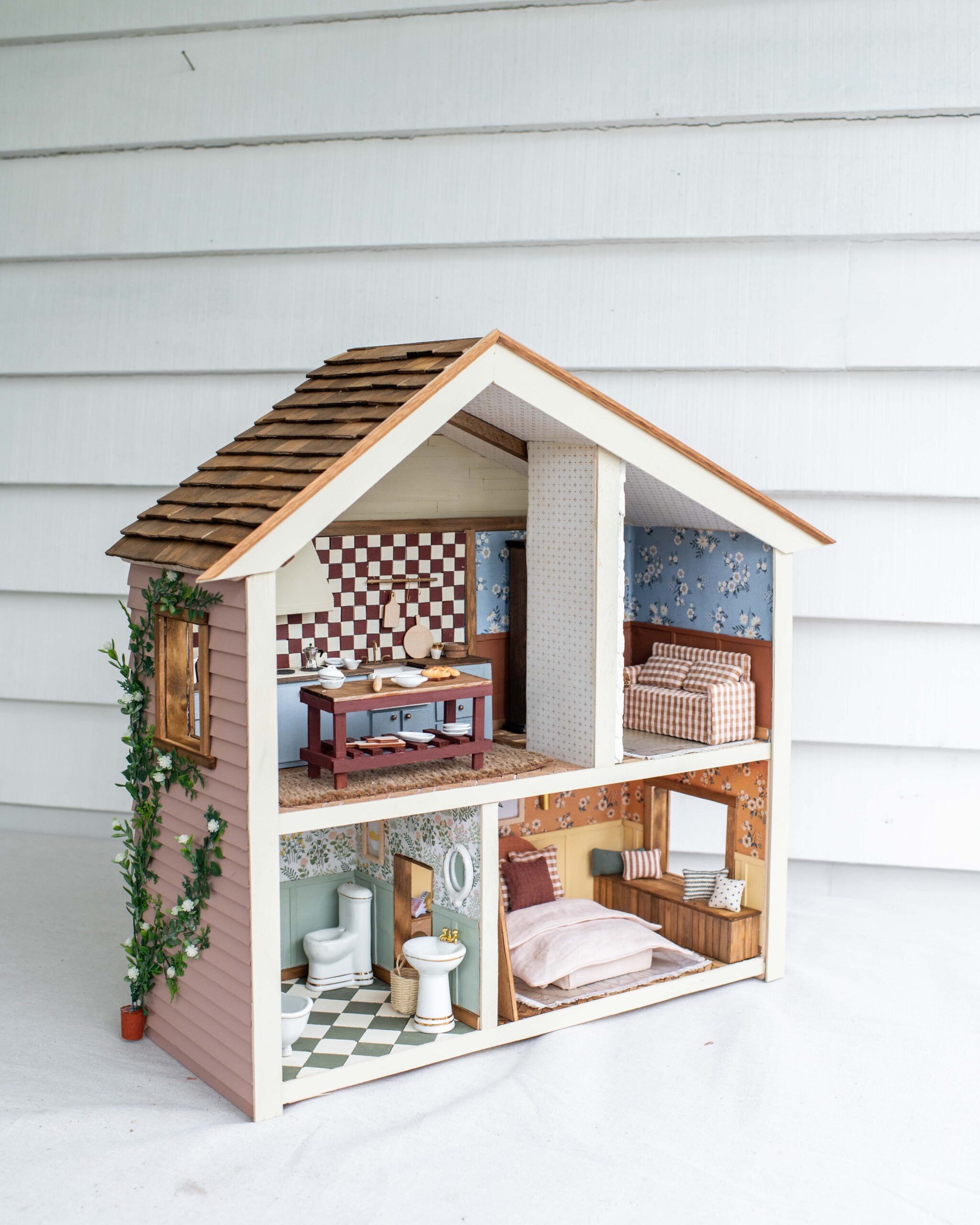 - I added Timber siding and a shingle roof to give it that real house vibes was next, and then it was time to get into the wallpaper. Wallpaper is like a cute outfit for a dollhouse so I would never skip it (it’s actually hard to find good wallpaper so I’ve included a bunch of my picks in the course).