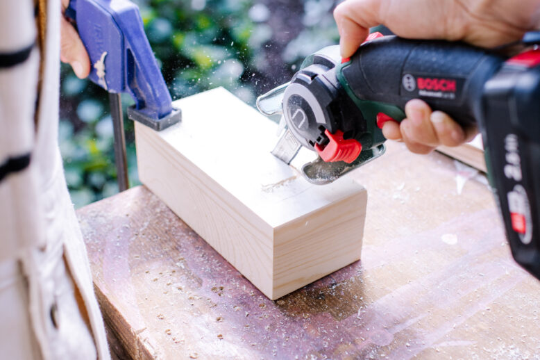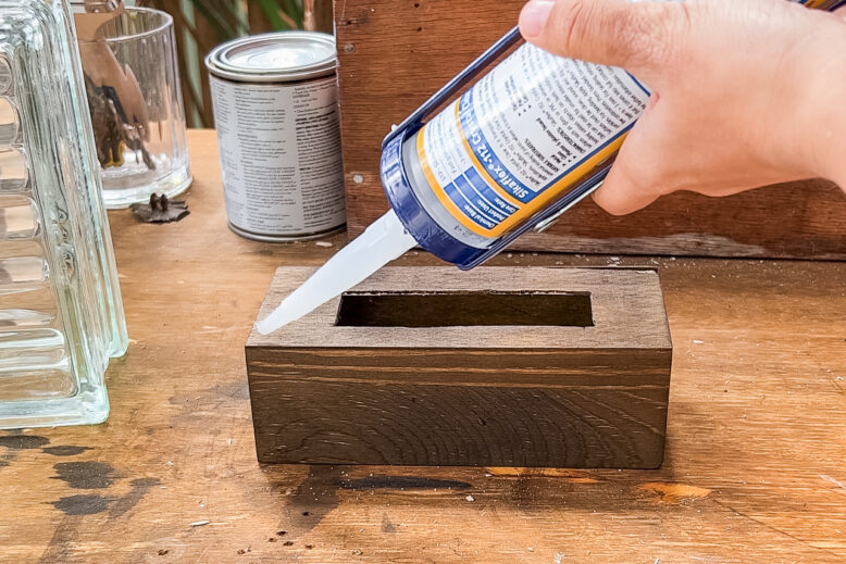I then moved onto cutting down the box to size so that the glass brick sat neatly on top. I measured out the size and then used my Bosch NanoBlade to cut it. I then cut a rectangle in to the top of the box (for the light to shine through). Once that one was done, I used wood glue to attach a scrap piece of wood to the back side to close in the opening. It now looks a bit like a tissue box! I also cut a small slot in the side of the box for the cord to sit.