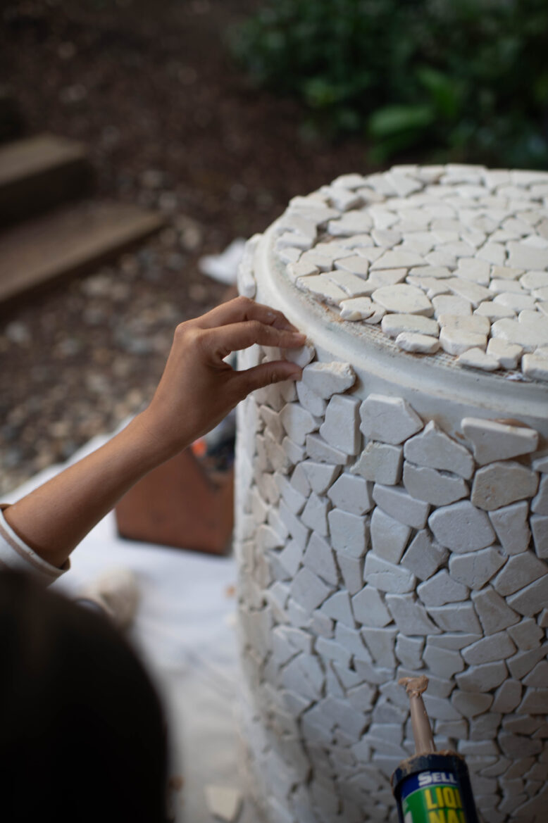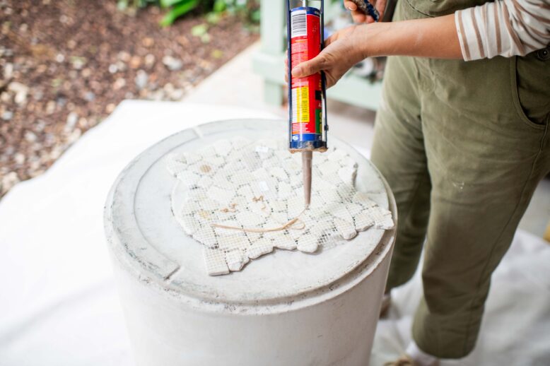 Start by placing liquid nails on the back of the tiles and place them on the top of the pot. The whole project was made easier because I chose tiles with netting on the back, so keep that in mind while picking what tile you want to use.