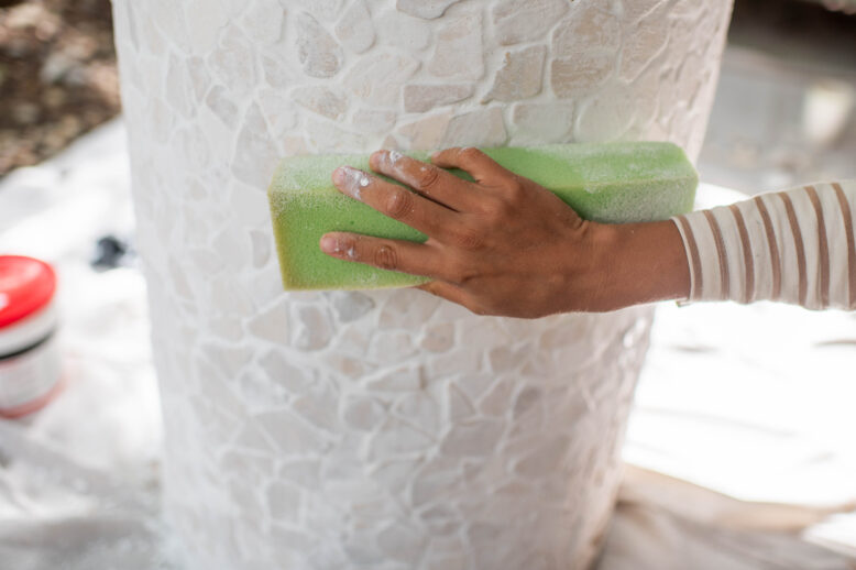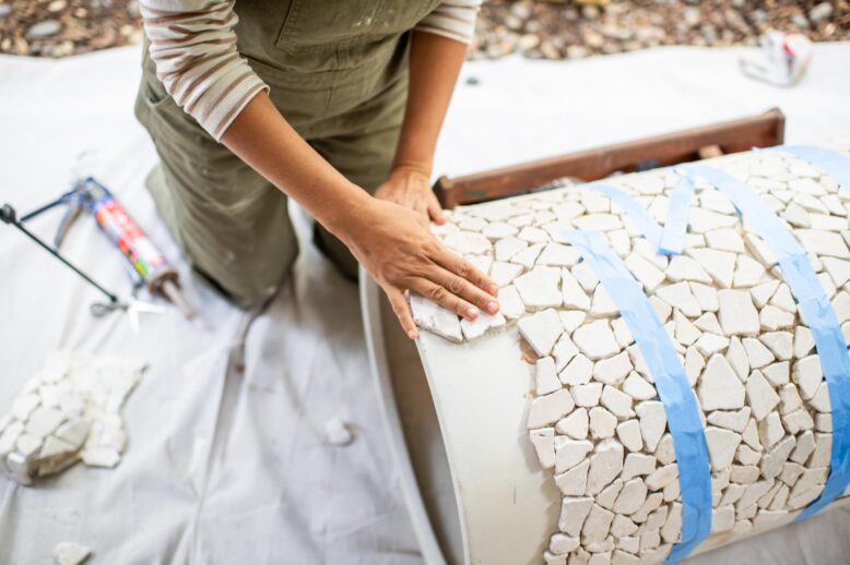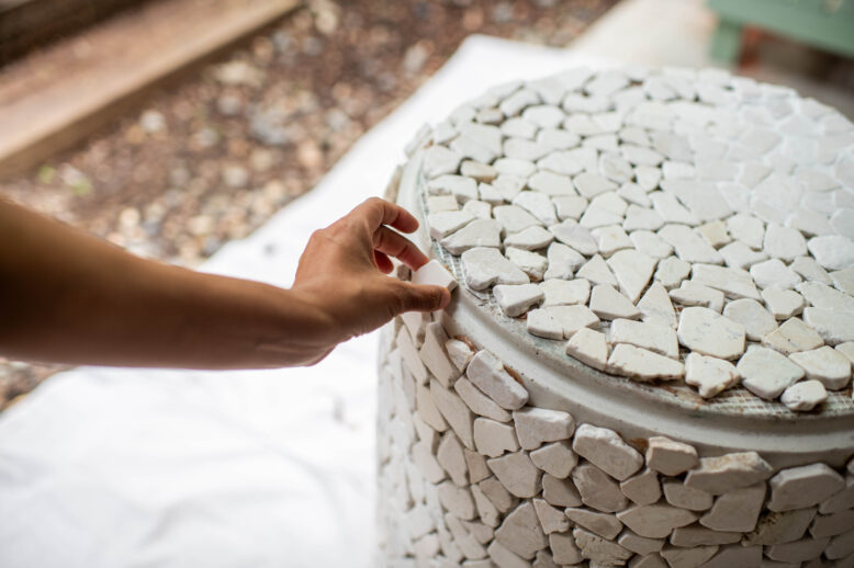 Work in sections adding more tiles to the pot. When the top is dry, gently turn the pot onto its side and continue to glue the tiles to the side of the pot. You might find it helpful to use some tape to hold everything in place while it dries.