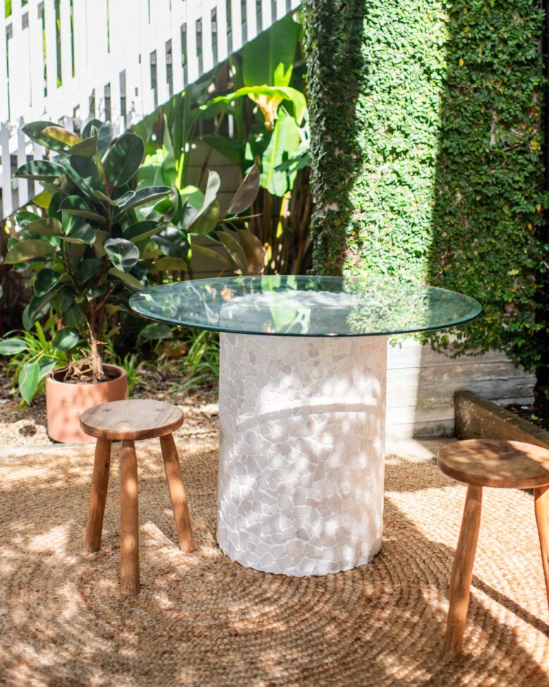 It’s my favourite time of year with the kerbside cleanup happening in my area, so I set myself a challenge to find items that are other people’s rubbish and upcycle them into new pieces. For this outdoor table, I was inspired when I found a round glass table top that was missing its base. So I decided to create my own with a large pot, some tiles and grout from Bunnings!