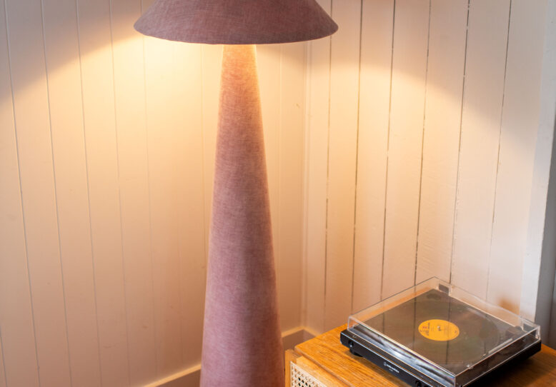 - Then once I was happy with how the cone was sitting in relation to the lamp base – it was time to start coving the cone in fabric! I used some spray adhesive and carefully secured down the velvet over both the cone and the lamp shade, making sure there was no bubbles in the fabric. To finish the edges, trim the fabric down and then fold over the edges using spray adhesive again.