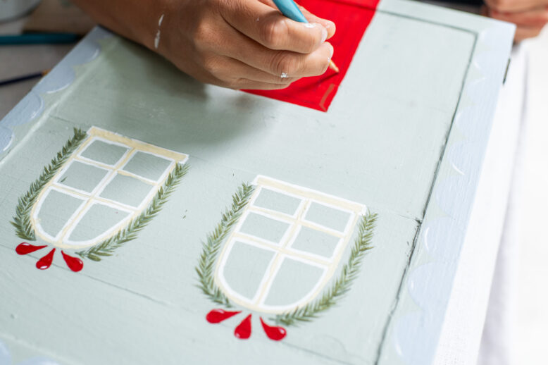 I sketched a basic design on the front including doors and windows and some decorations, and then used paint to bring those to life. You can keep it simple or go all out at this point!