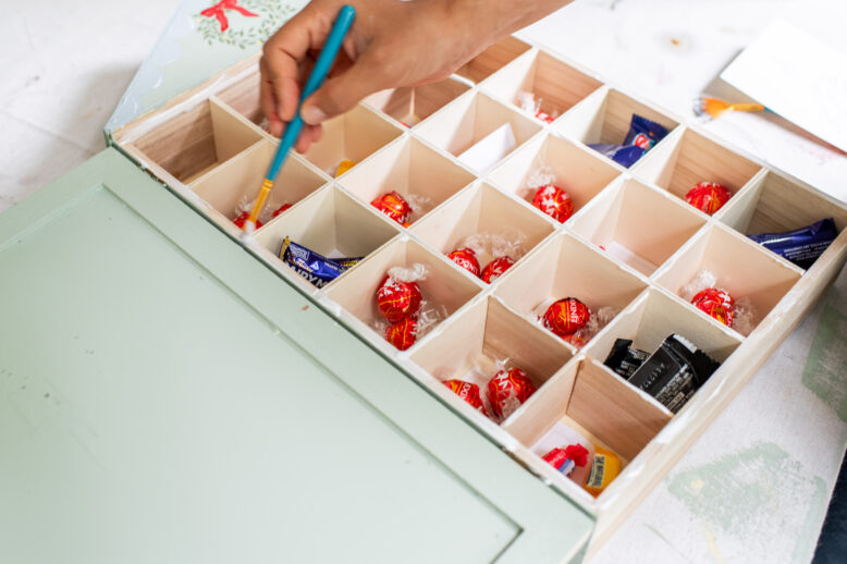 To the compartments, I added small gifts (hair clips, washi tape, etc), chocolates and the printable advent activities (link above) and then applied PVA glue on the edges all the way around each box.