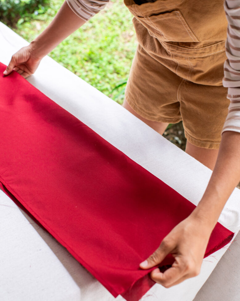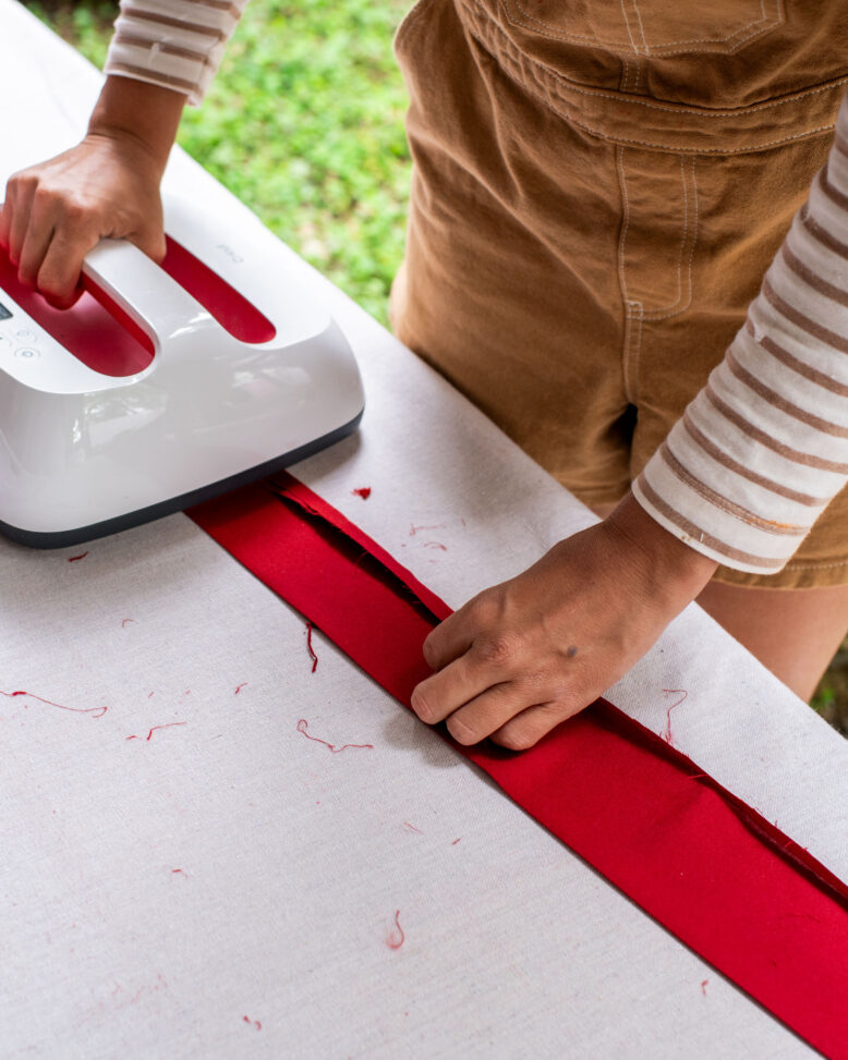 Then cut a strip of fabric slightly wider than the width of the centre of the bow and iron the edges over to create clean edges.. This is what we will use to wrap the bow and tails together.